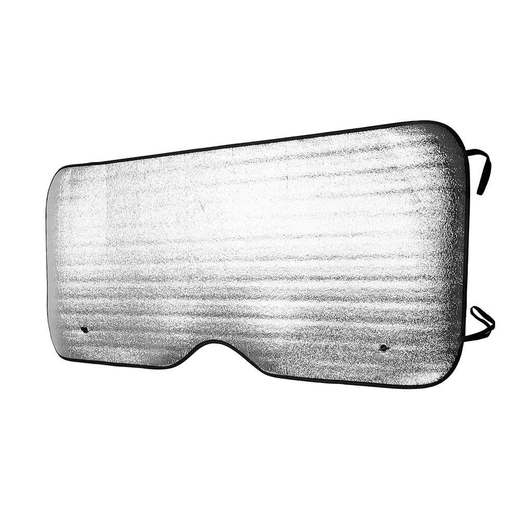 Parasol para coche con el frontal de aluminio y la parte trasera de espuma blanca. Dos argollas metálicas en ambas esquinas superiores para la introducción de ventosas de sujeción. Ribete y gomas elásticas para su enrollado en color negro.