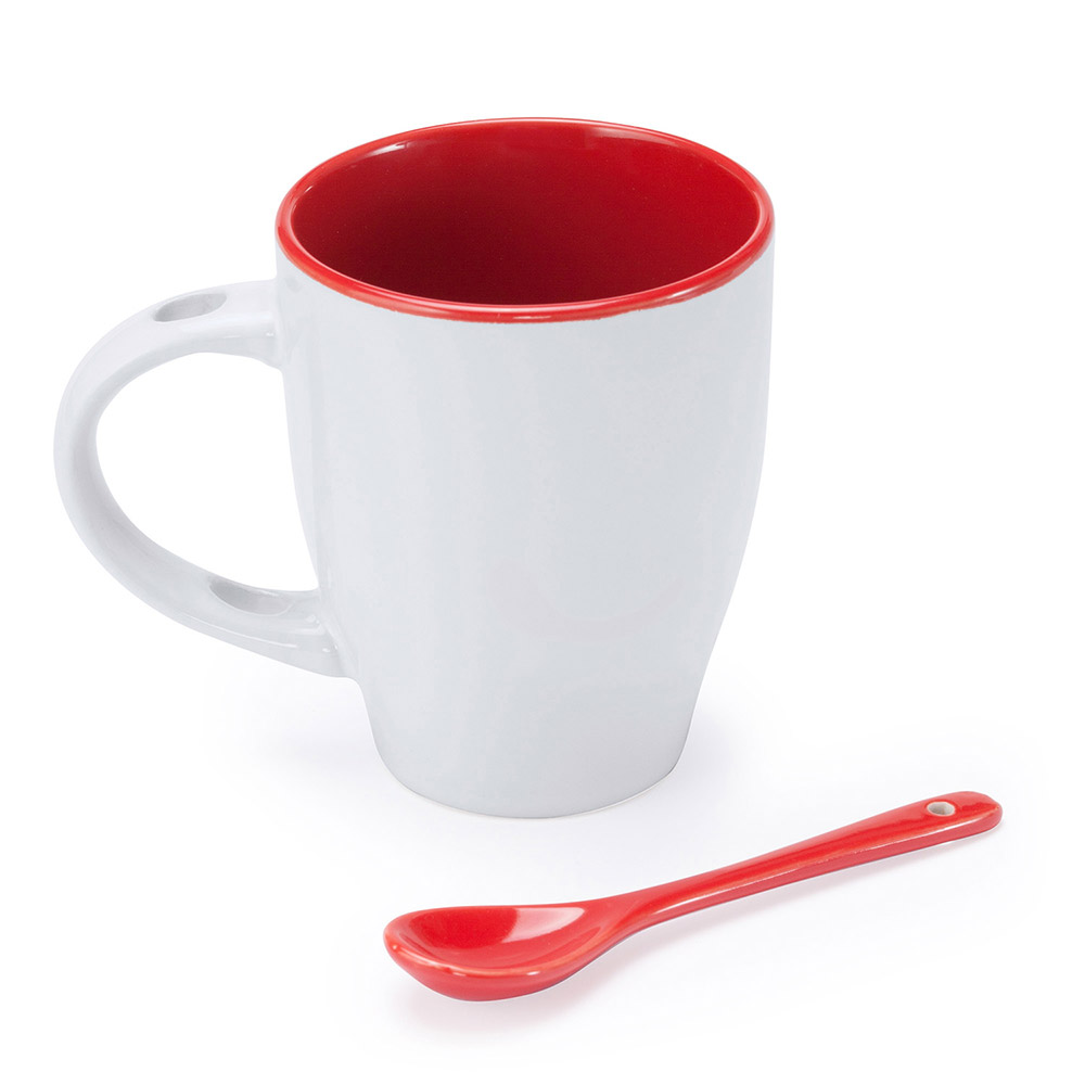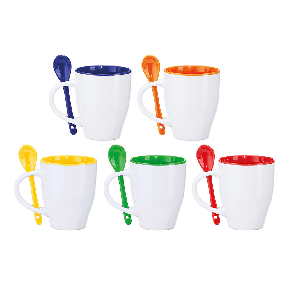 Taza de cerámica con capacidad de 350 ml. Interior y cuchara a color, a juego.