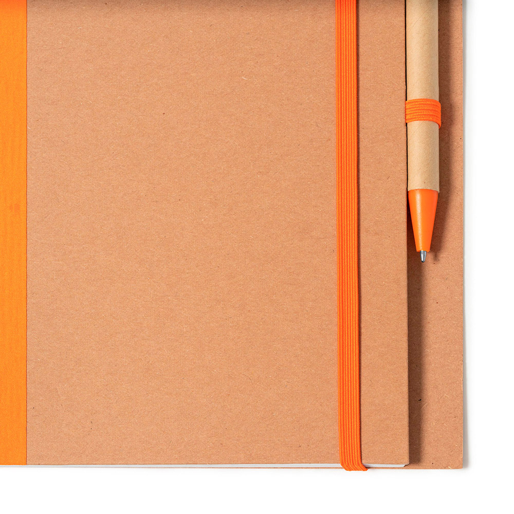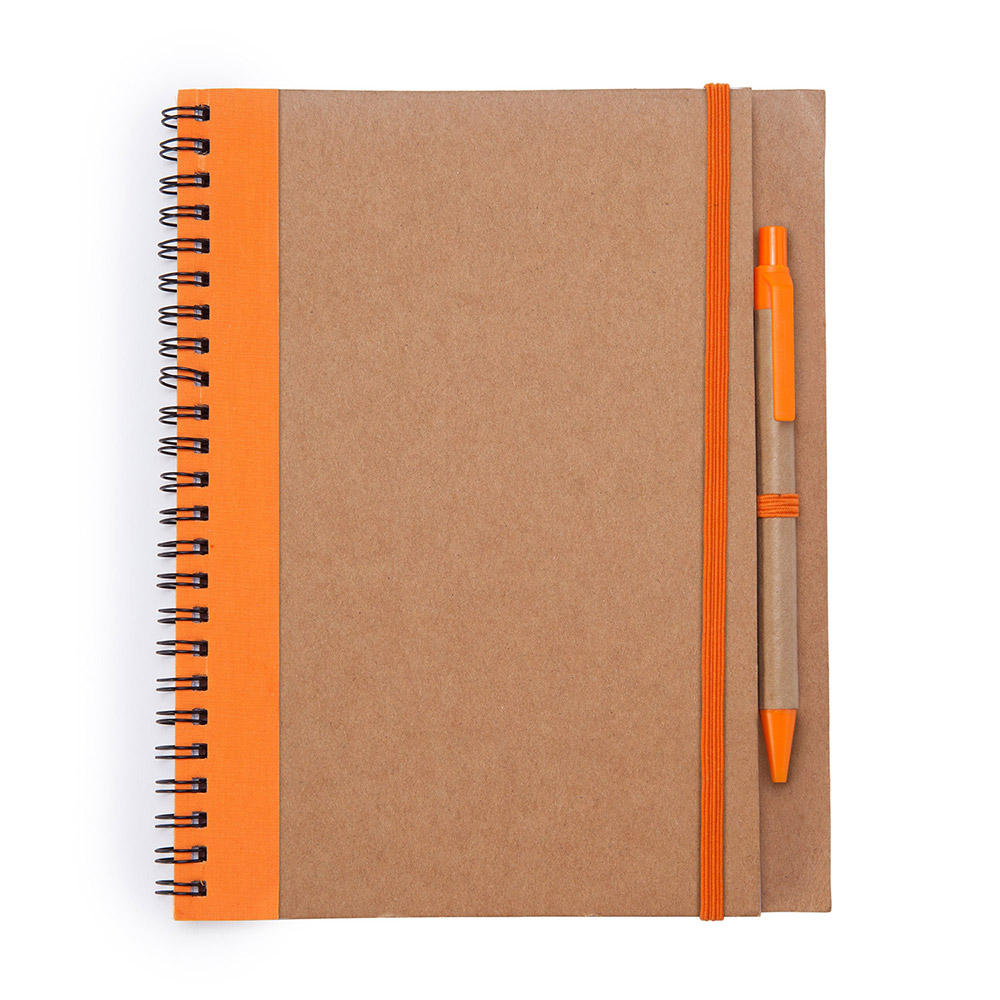 Libreta con espiral y tapa rígida de cartón reciclado. Incluye bolígrafo a juego con tinta azul. 60 hojas lisas.