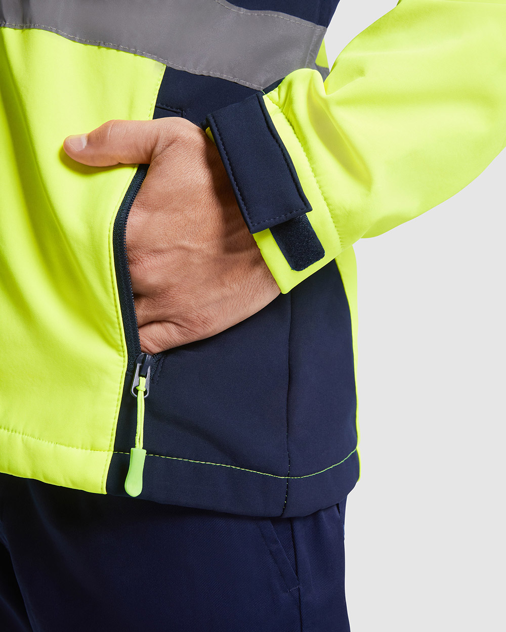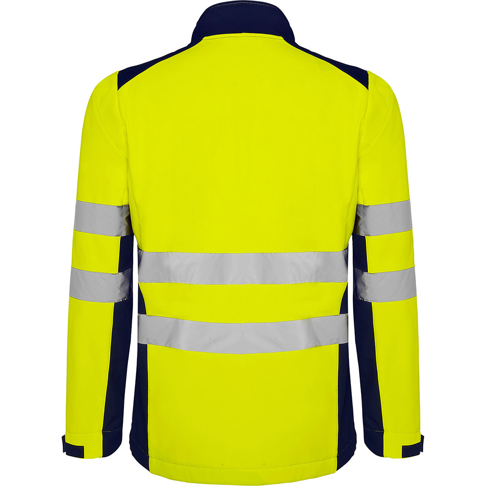 Softshell bicolor de alta visibilidad resistente al agua, tejido interior suave de alta capacidad térmica.