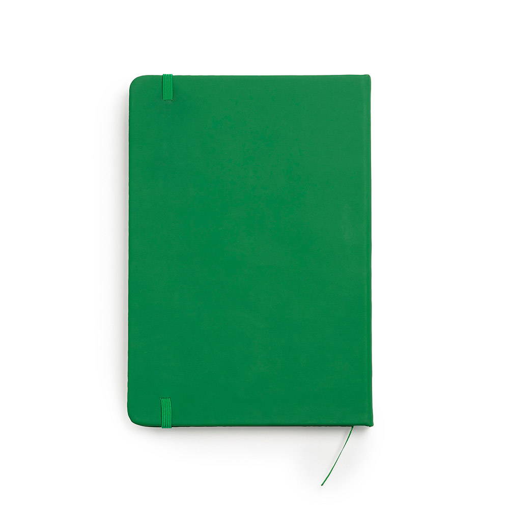 Bloc de notas A5 con tapa rígida de polipiel. Marca páginas y banda elástica. 100 hojas a una raya.