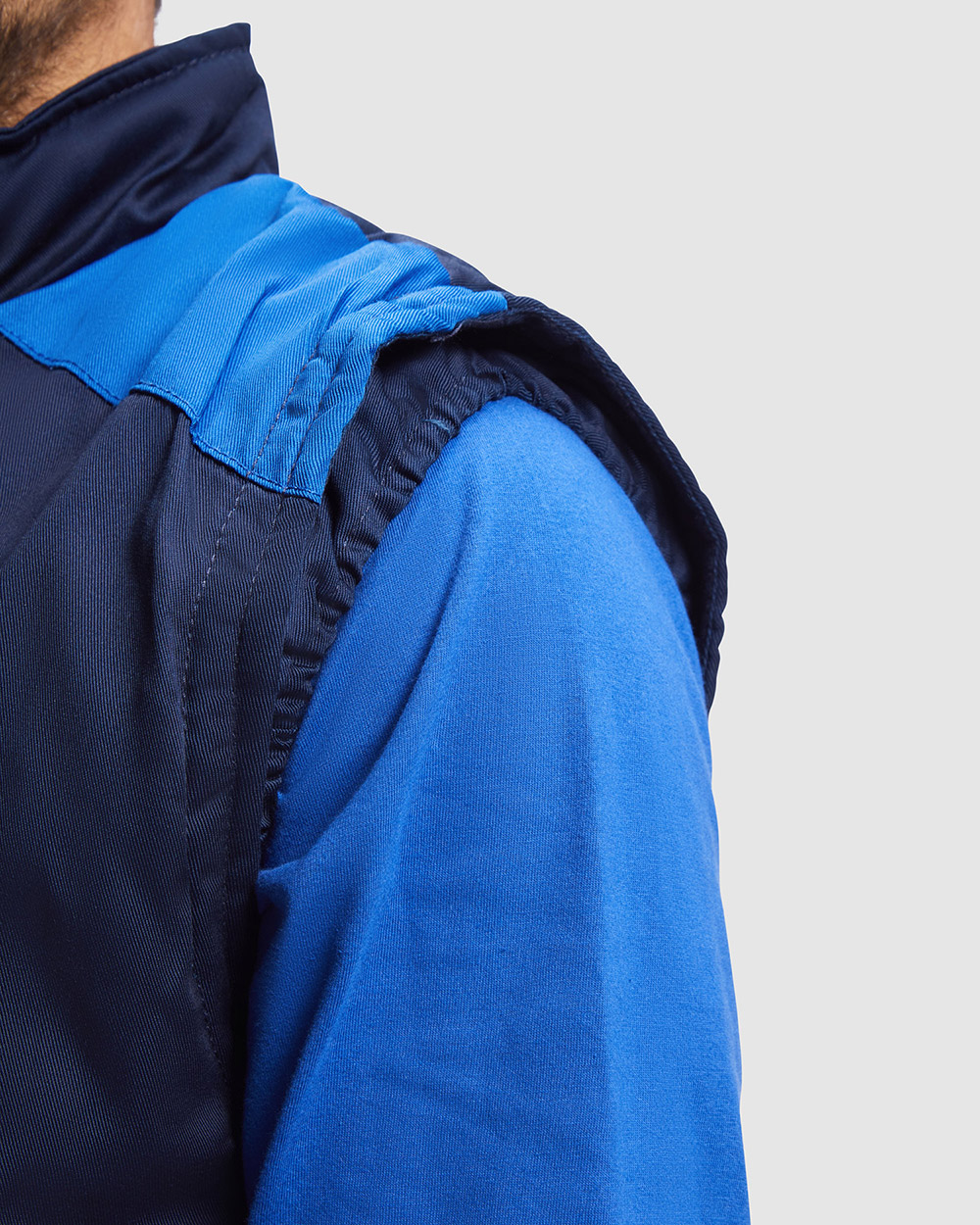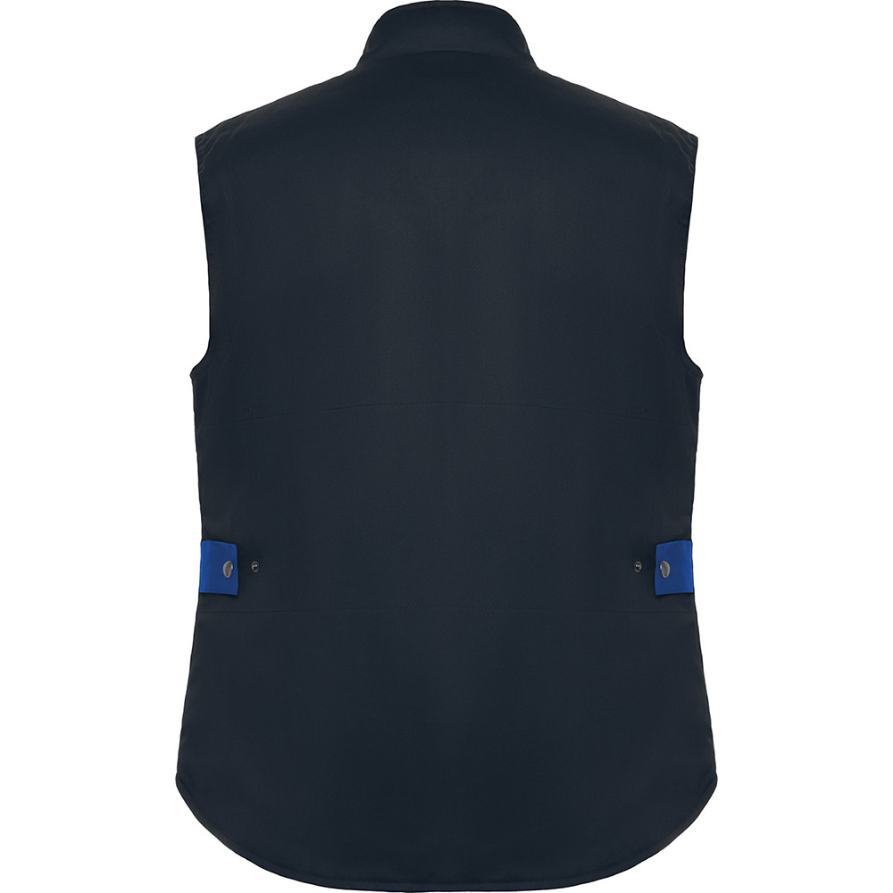 Chaleco laboral multibolsillos con cuello alto en colores combinados.