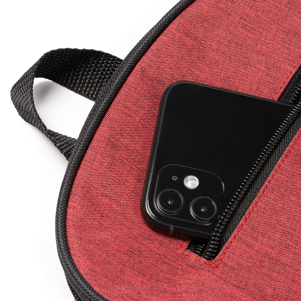 Mochila realizada en 300D RPET. Bolsillo principal y frontal con cierre de cremallera. Asas acolchadas y bolsillos laterales de diseño microperforado.
