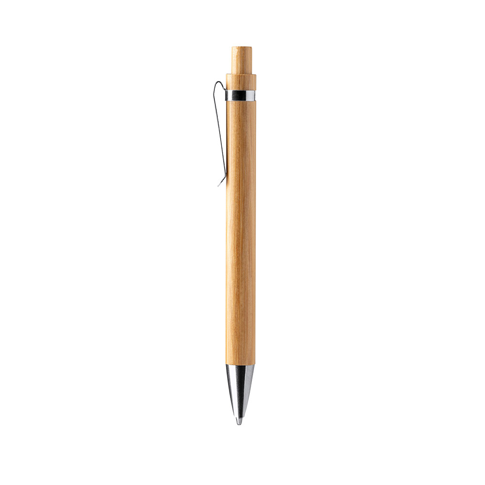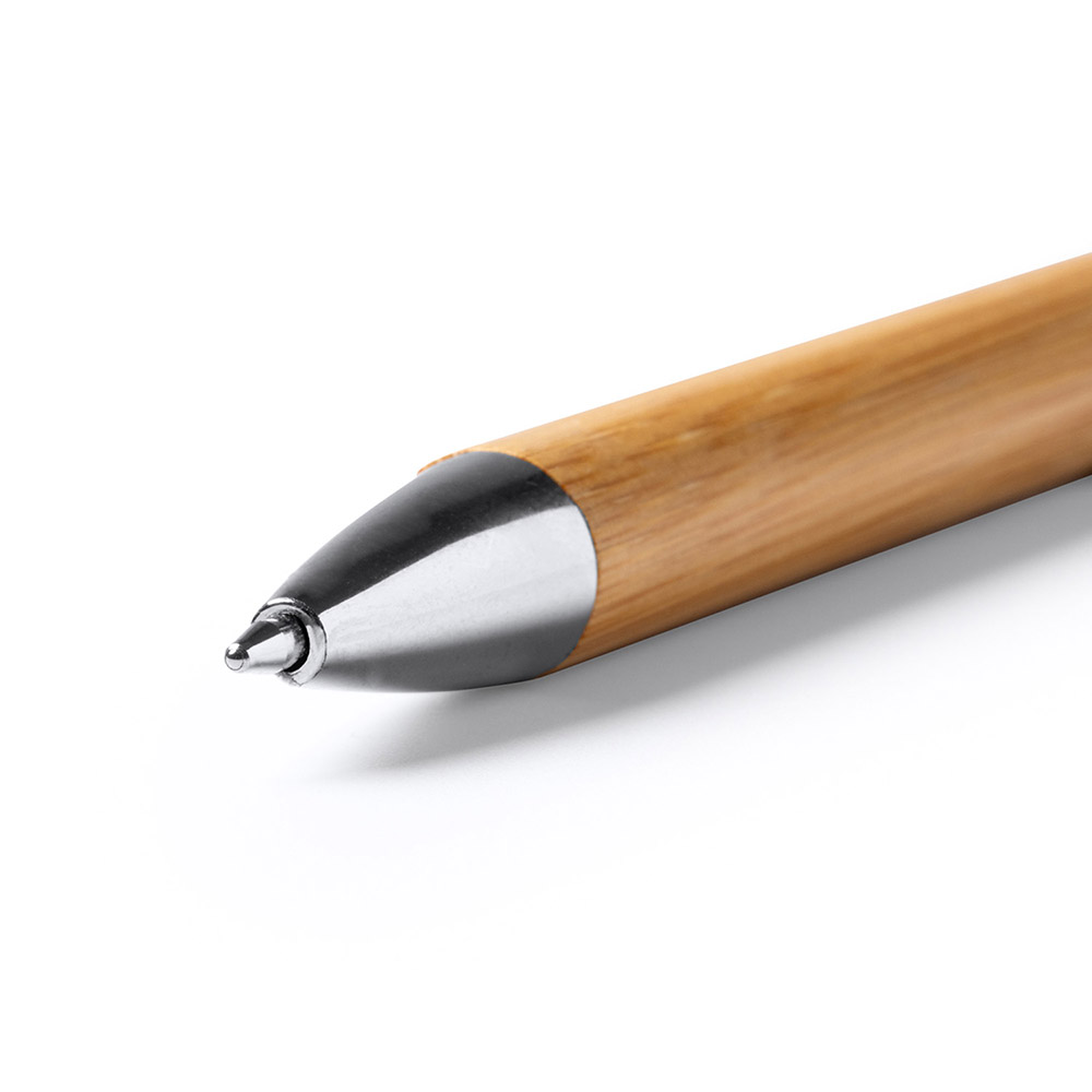 Bolígrafo realizado en bambú con detalles metálico. Tinta azul.