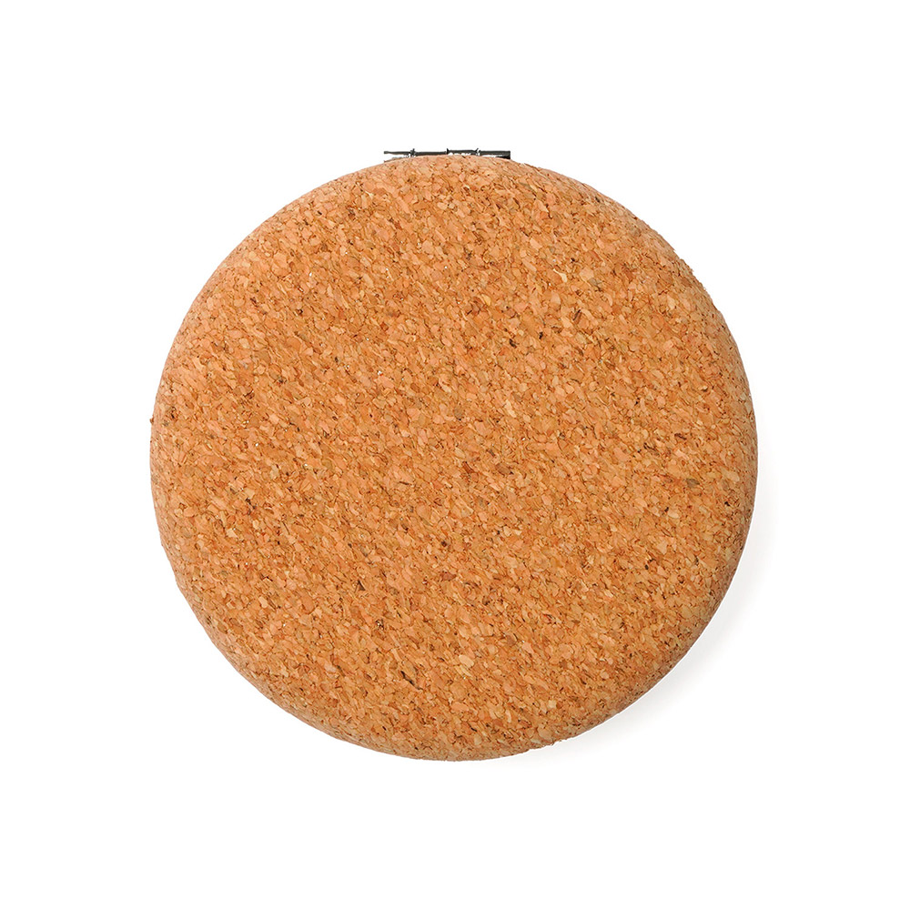 Espejo plegable de bolsillo realizado en corcho natural y metal cromado, compuesto por dos espejos, uno normal y otro de aumento.