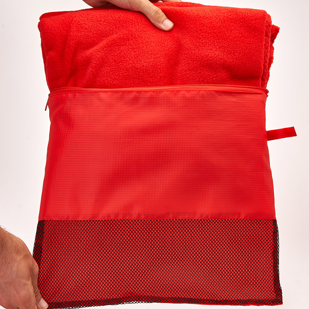 Manta de forro polar de 200 g/m² en color liso con funda a juego. Tratamiento anti-pilling en uno de los lados. Funda rectangular realizada en poliéster tela Oxford y rejilla, con cremallera del mismo color.