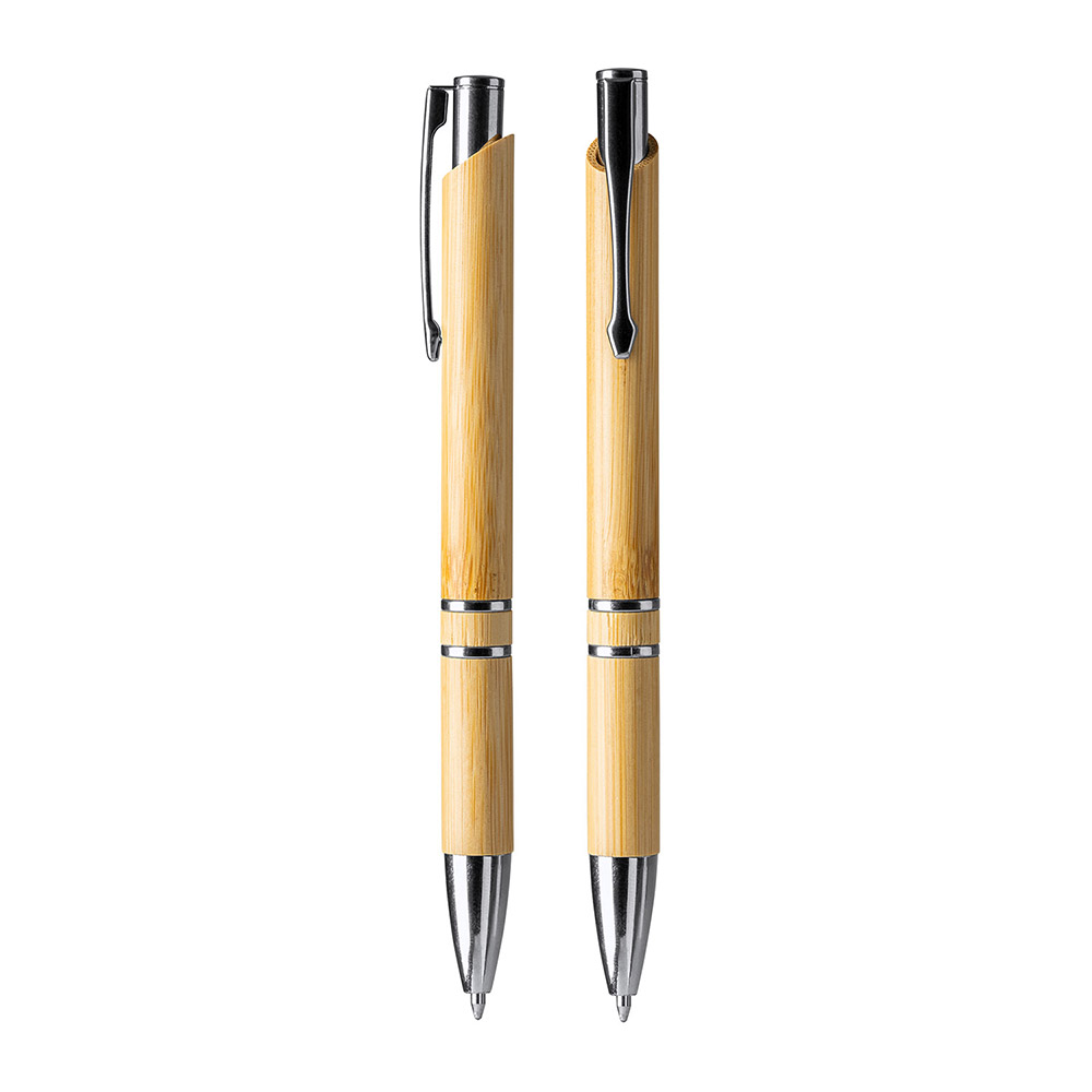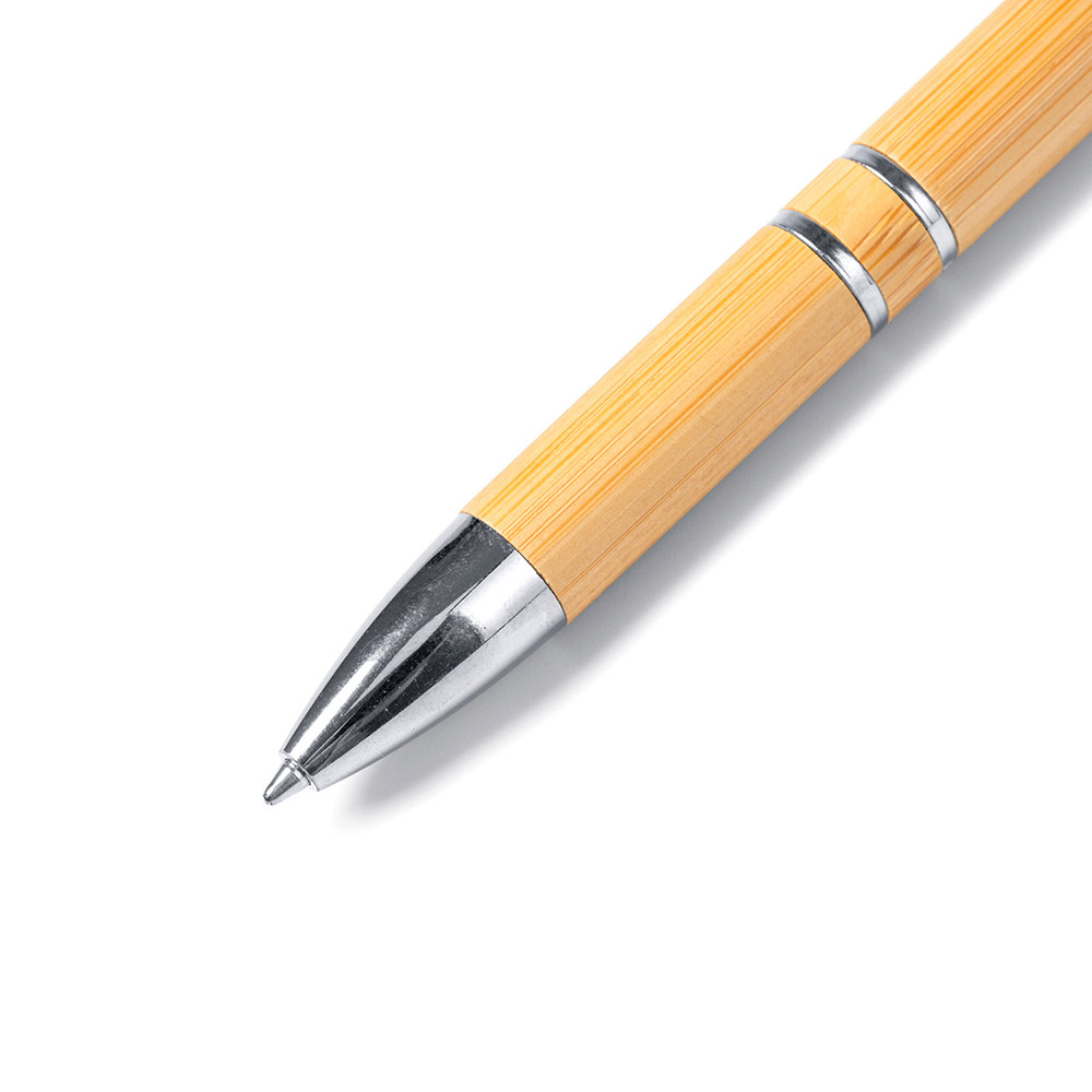 Bolígrafo con cuerpo de bambú y pulsador en acabado metalizado. Carga jumbo de tinta azul.