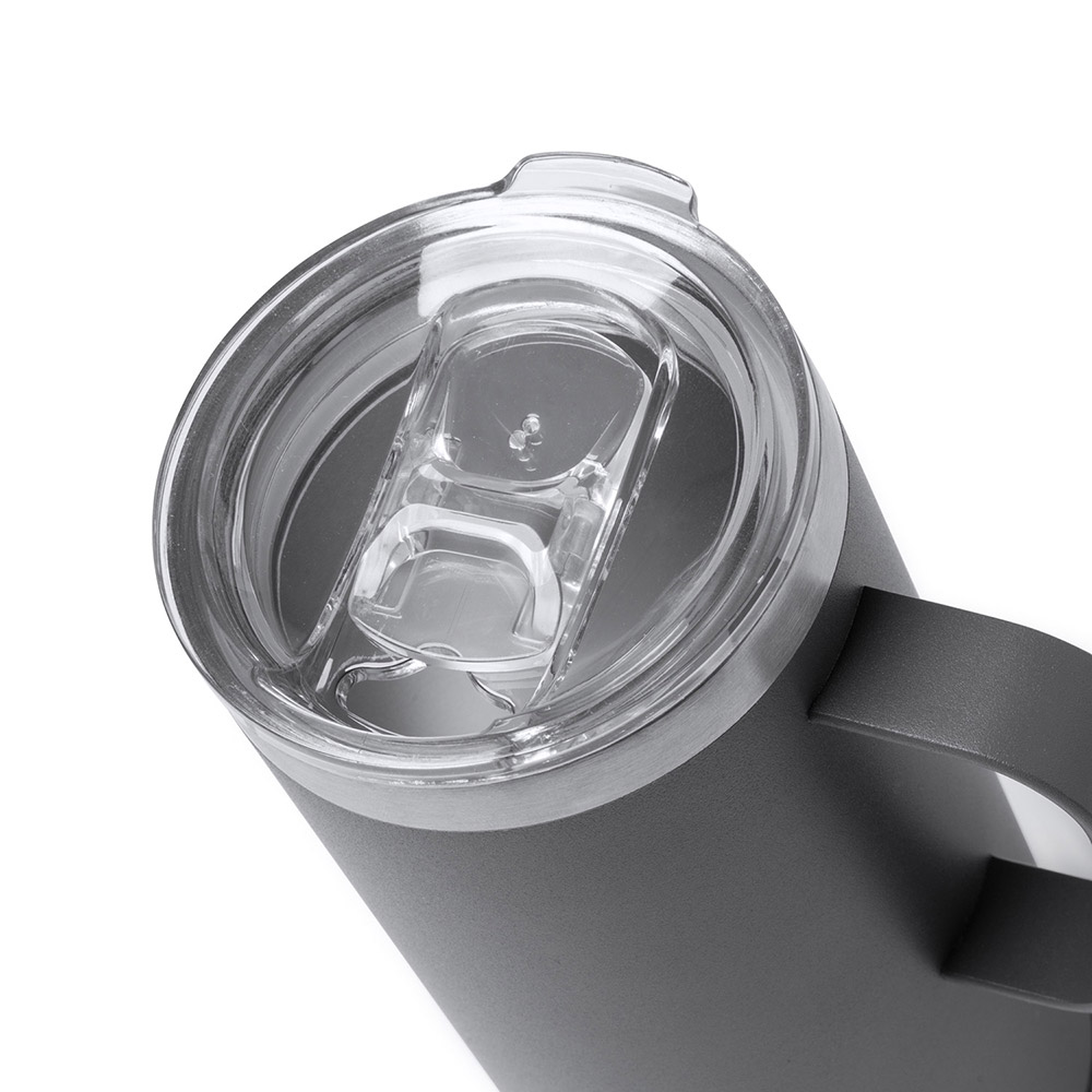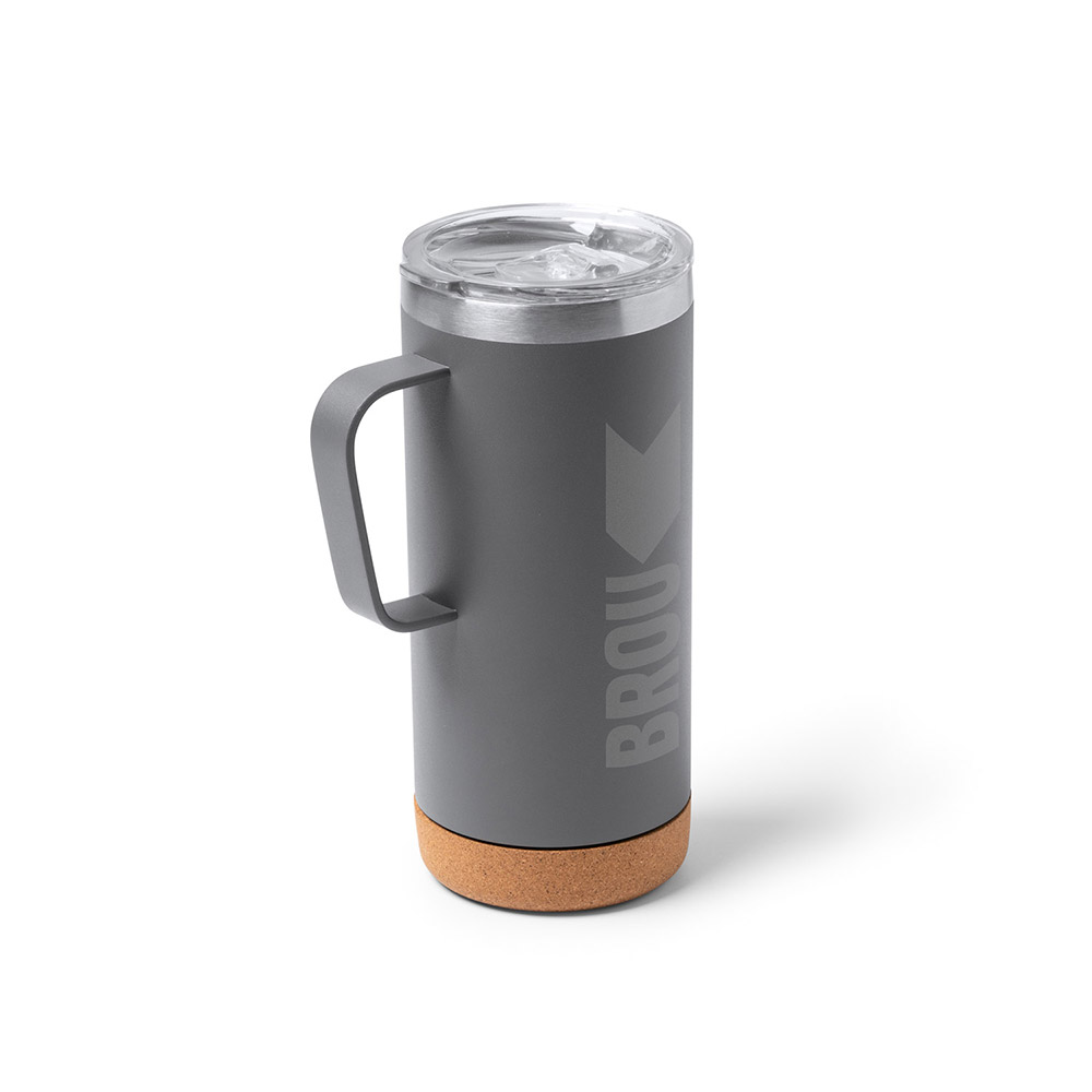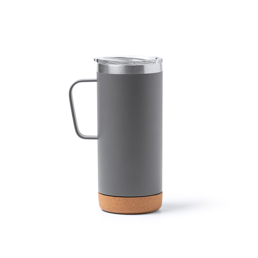 Taza de acero inoxidable reciclado de doble pared con base de corcho y tapa de seguridad transparente. Capacidad de 600 ml.