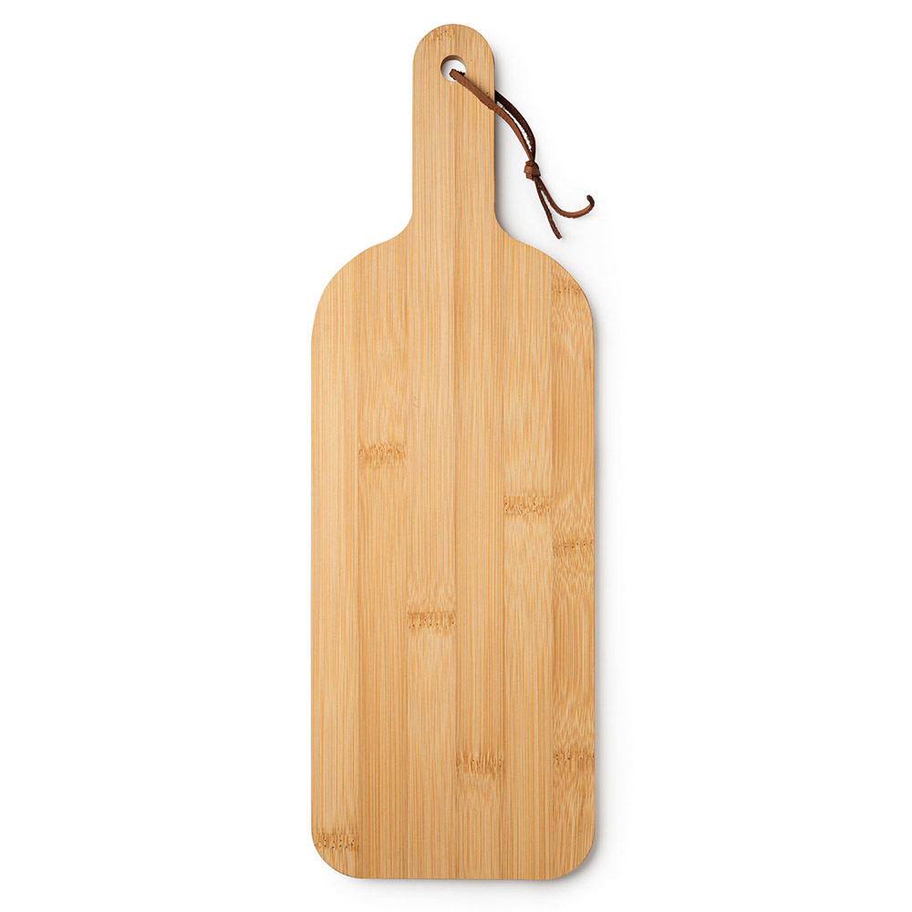 Tabla de cortar de bambú con mango para fácil manejo y cuerda para colgar, perfecta para el uso diario.