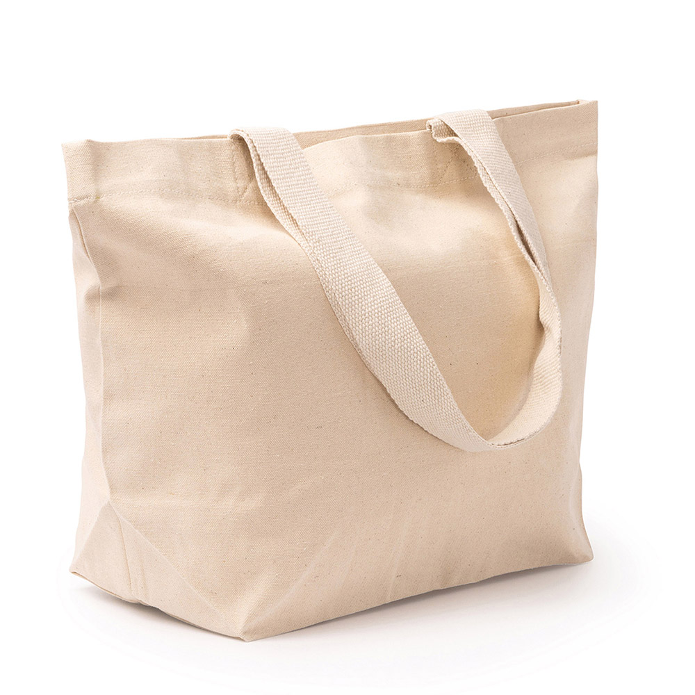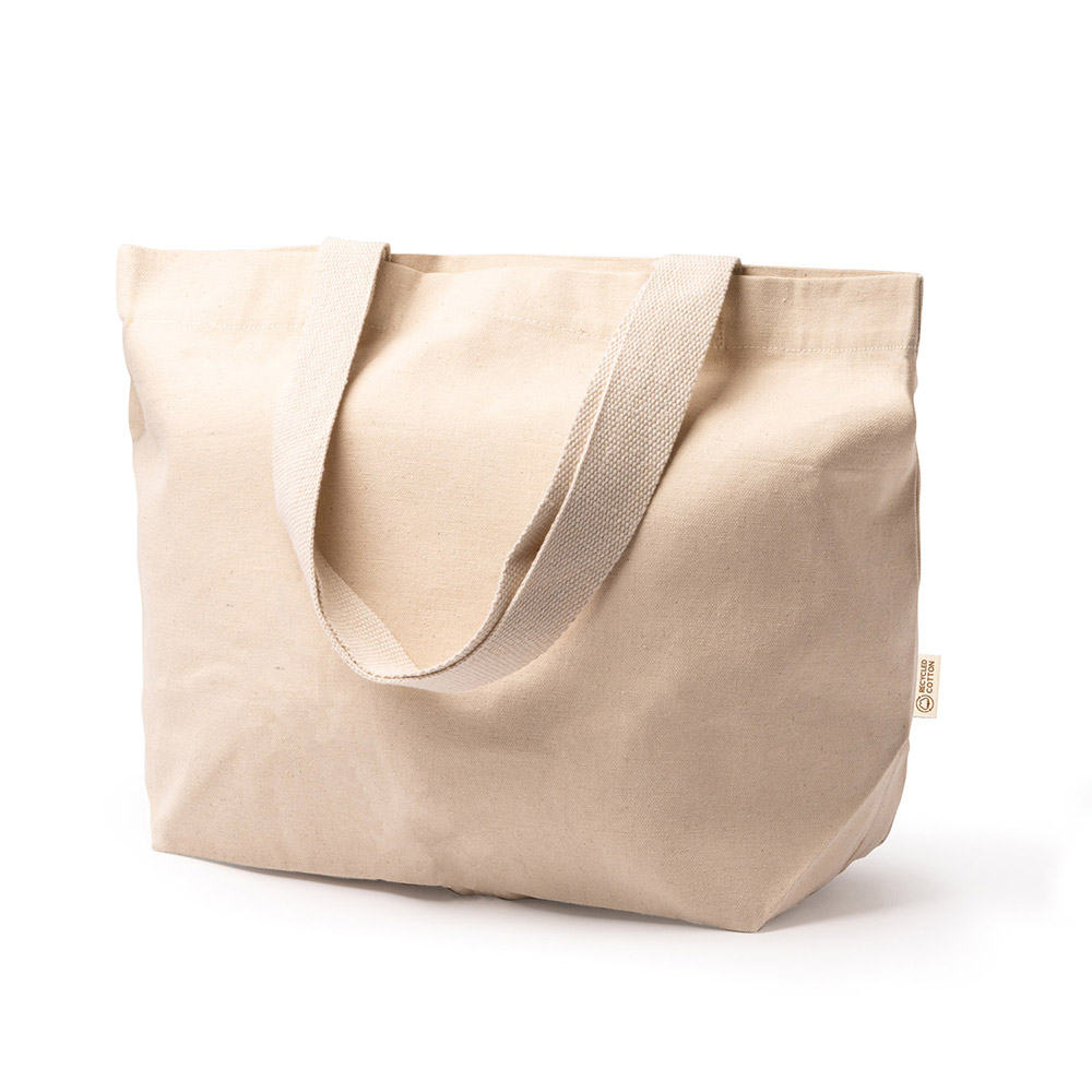 Bolsa gran formato de algodón canvas reciclado 330 g/m². Asas largas reforzadas de 70 cm.