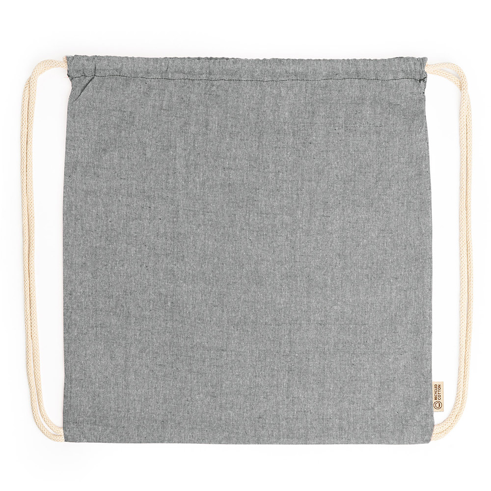 Mochila de cordones en algodón reciclado de 120 g/m² con acabado jaspeado y cordones en color natural. Disponible en varios colores.