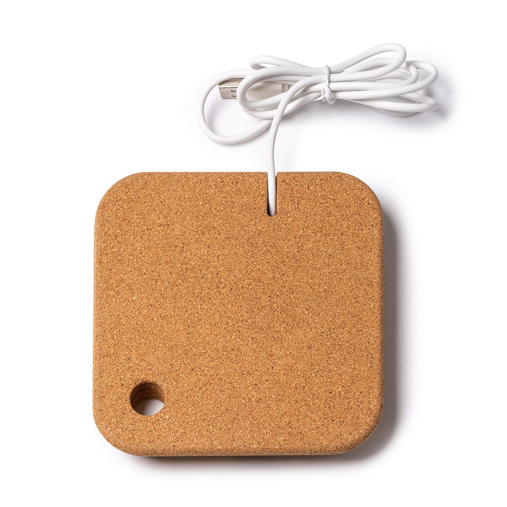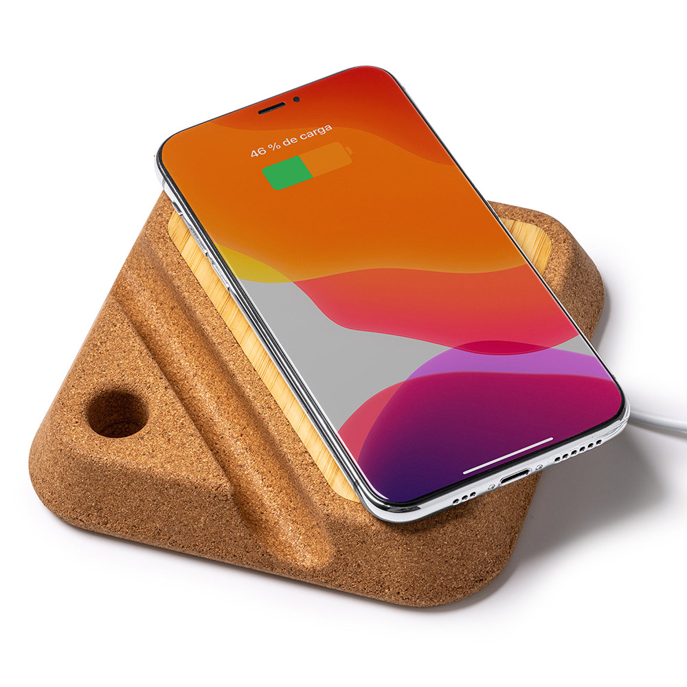 El cargador inalámbrico con cuerpo elaborado en corcho y superficie de carga inalámbrica en bambú.