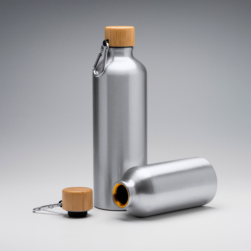 Bidón de aluminio con mosquetón para un fácil transporte y tapón de bambú. Capacidad de 800 ml.