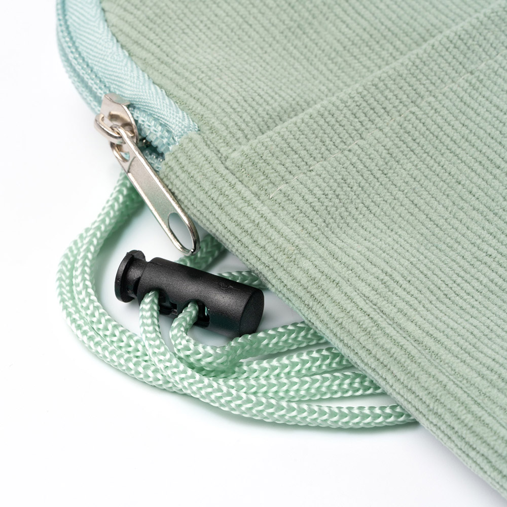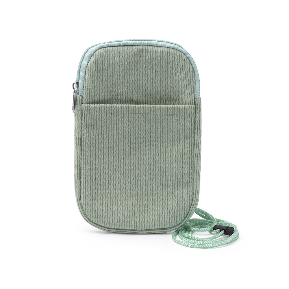 Portamóvil realizado en tejido de pana. Compartimento principal con cierre de cremallera a juego. Bolsillo exterior. Incluye cinta de transporte a juego.