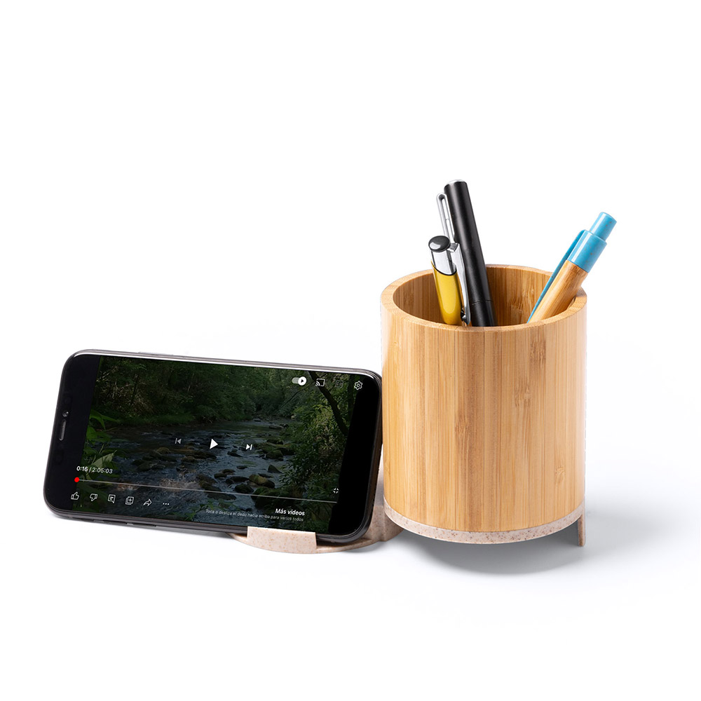 Lapicero multifunción con cuerpo elaborado en bambú y base con función de cargador inalámbrico realizado en fibra de trigo.
