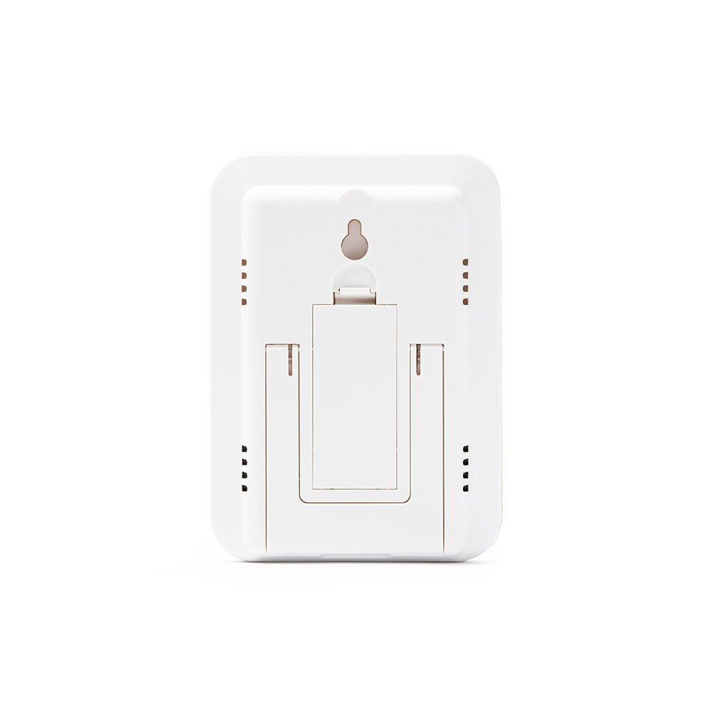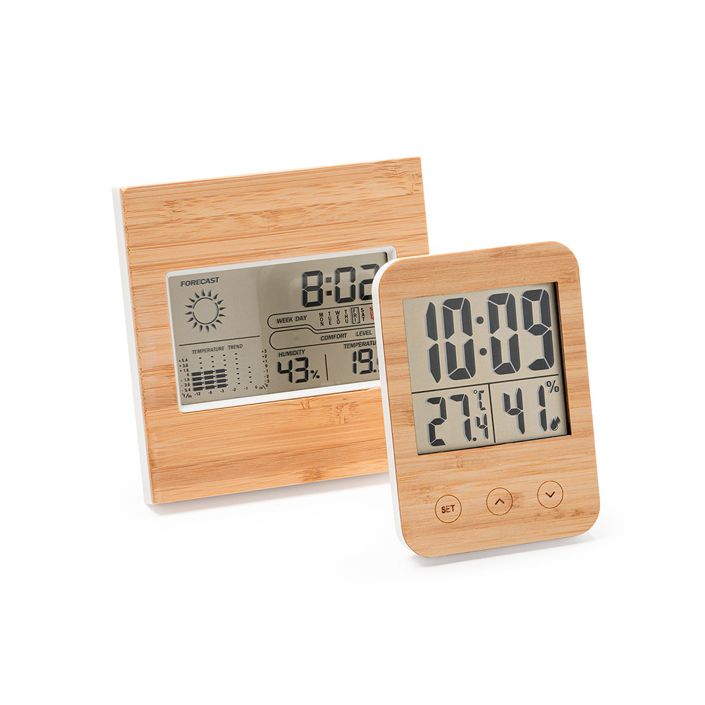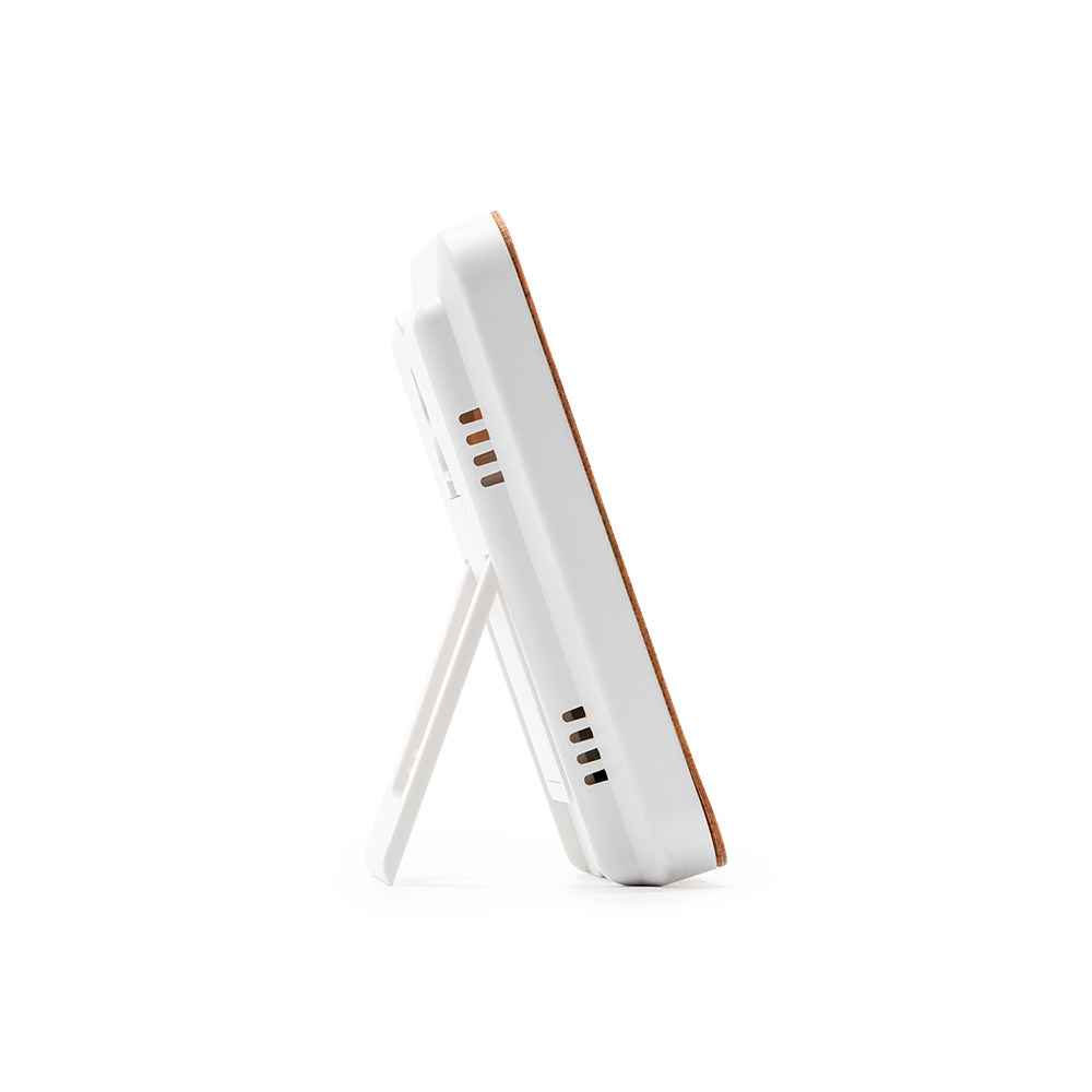 Estación meteorológica con carcasa frontal de bambú. Función reloj con sensores de temperatura y humedad. Panel de control táctil. Registro de temperatura y humedad máxima y mínima. Funciona con 2 pilas AAA no incluidas.