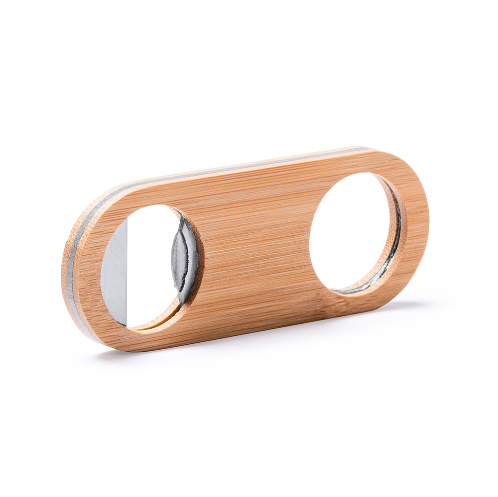Abridor de diseño compacto realizado en bambú con interior de acero inoxidable y troquel superior para colgar.