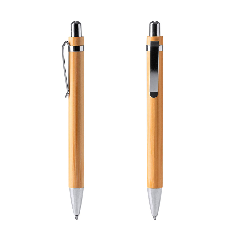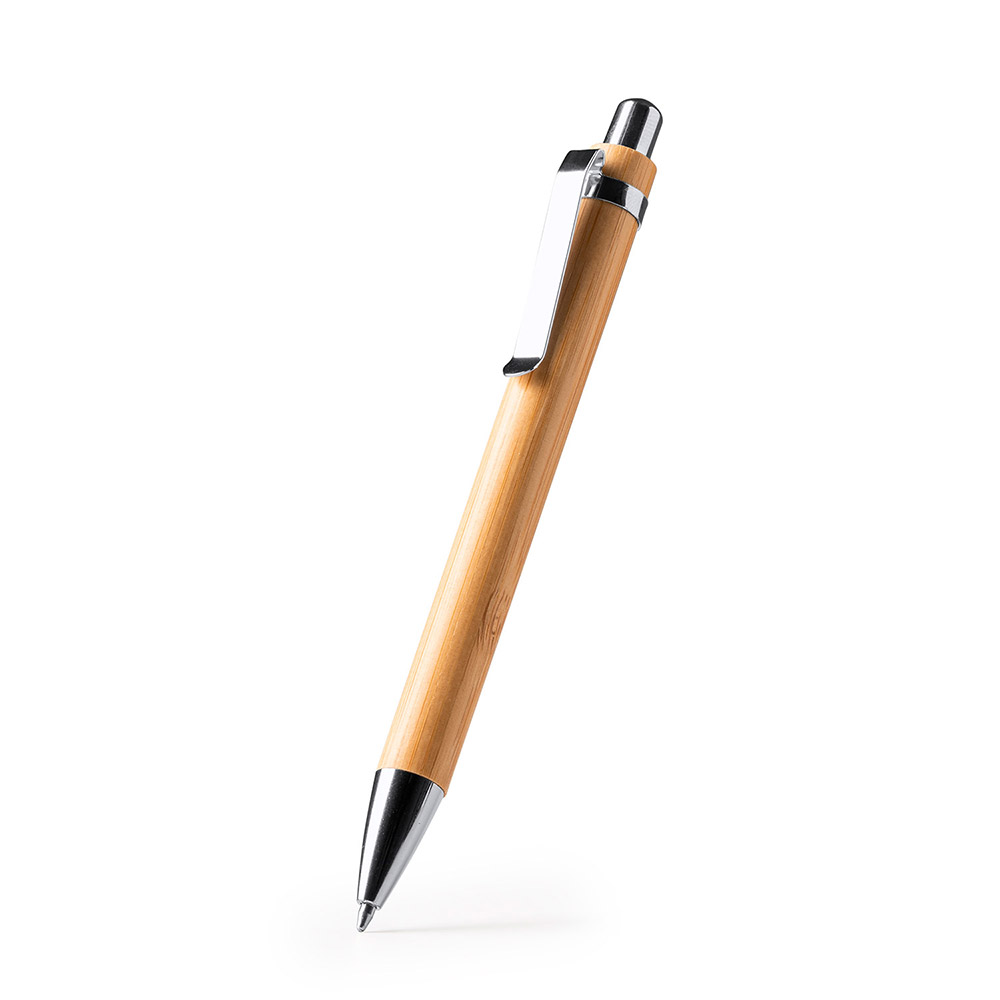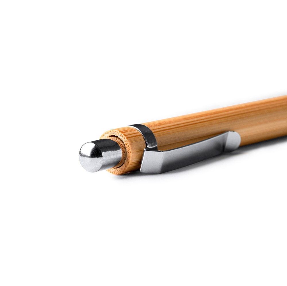 Bolígrafo elegante con cuerpo de bambú con pulsador y accesorios en acabado metálicos. Idóneo bolígrafo para tu escritorio.