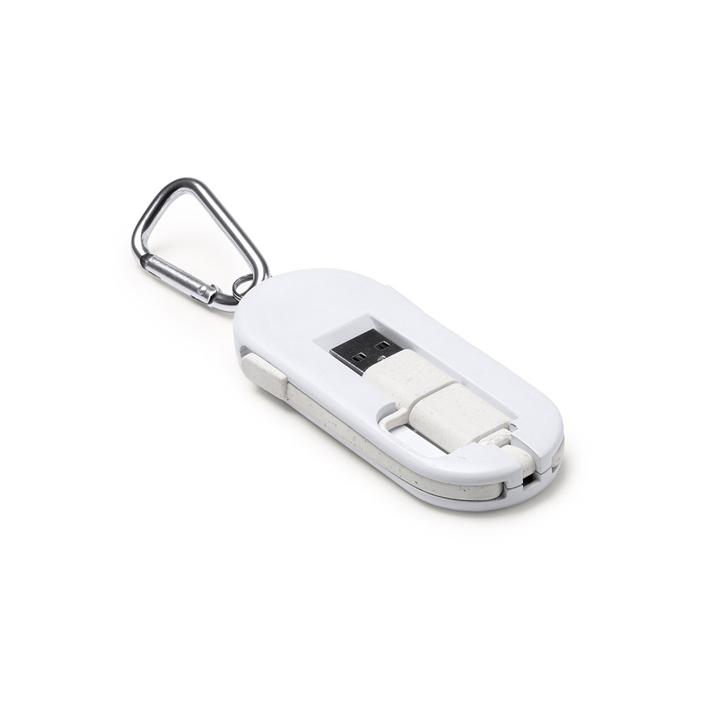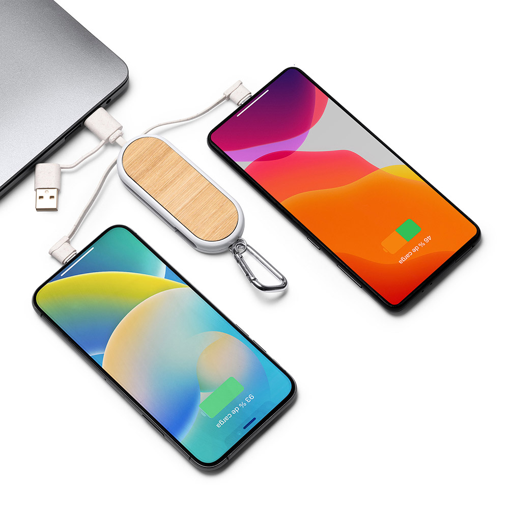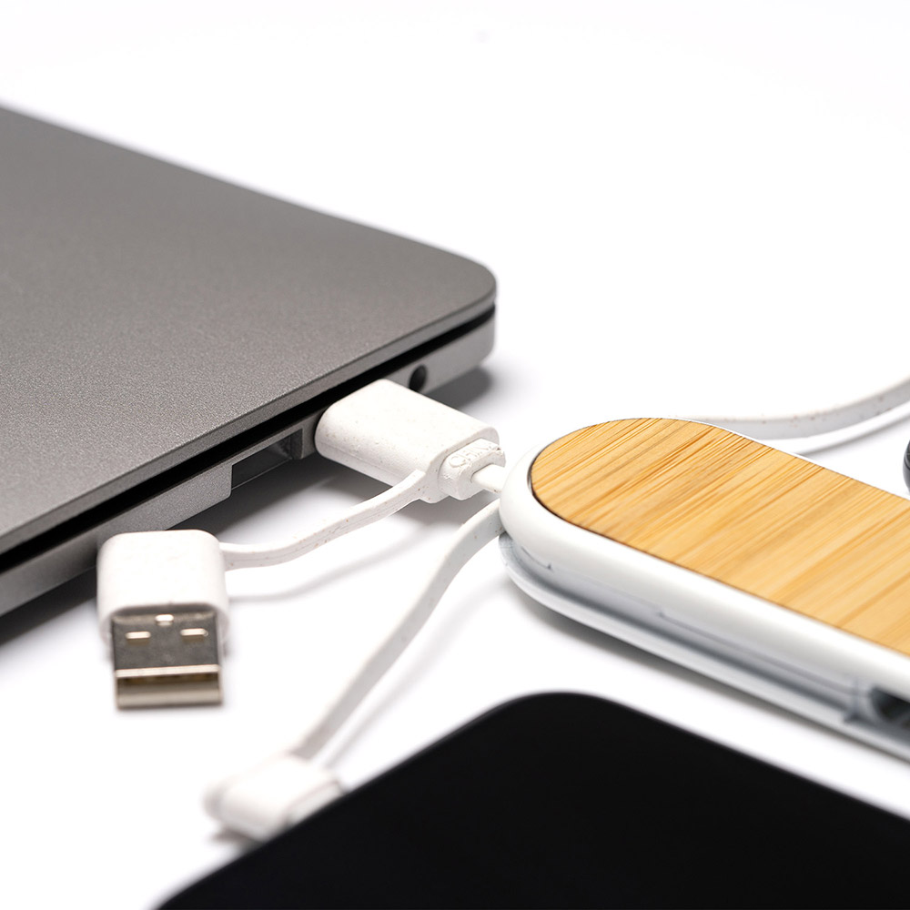 El cable cargador 5 en 1 es una solución versátil y conveniente para cargar tus dispositivos. Su cuerpo está fabricado con una combinación de fibra de trigo y bambú, lo que le confiere un aspecto natural y sostenible.