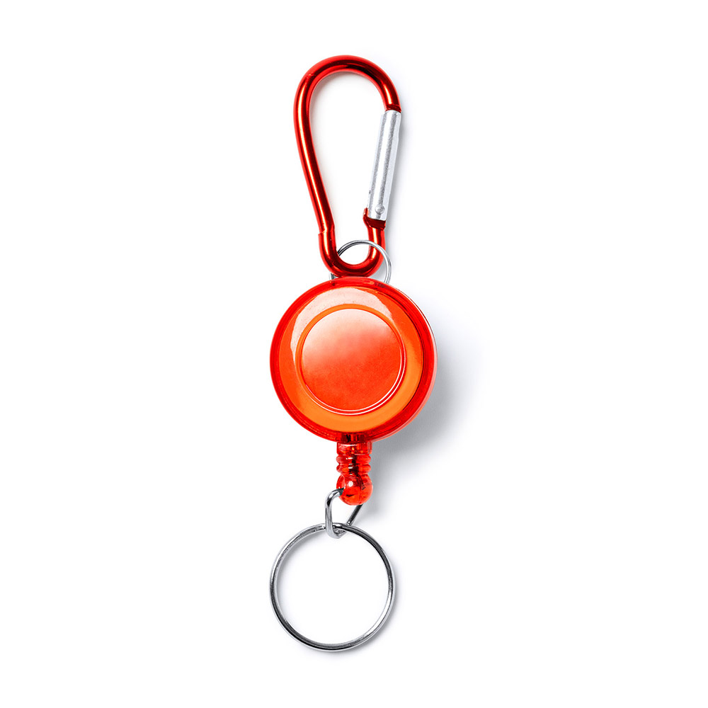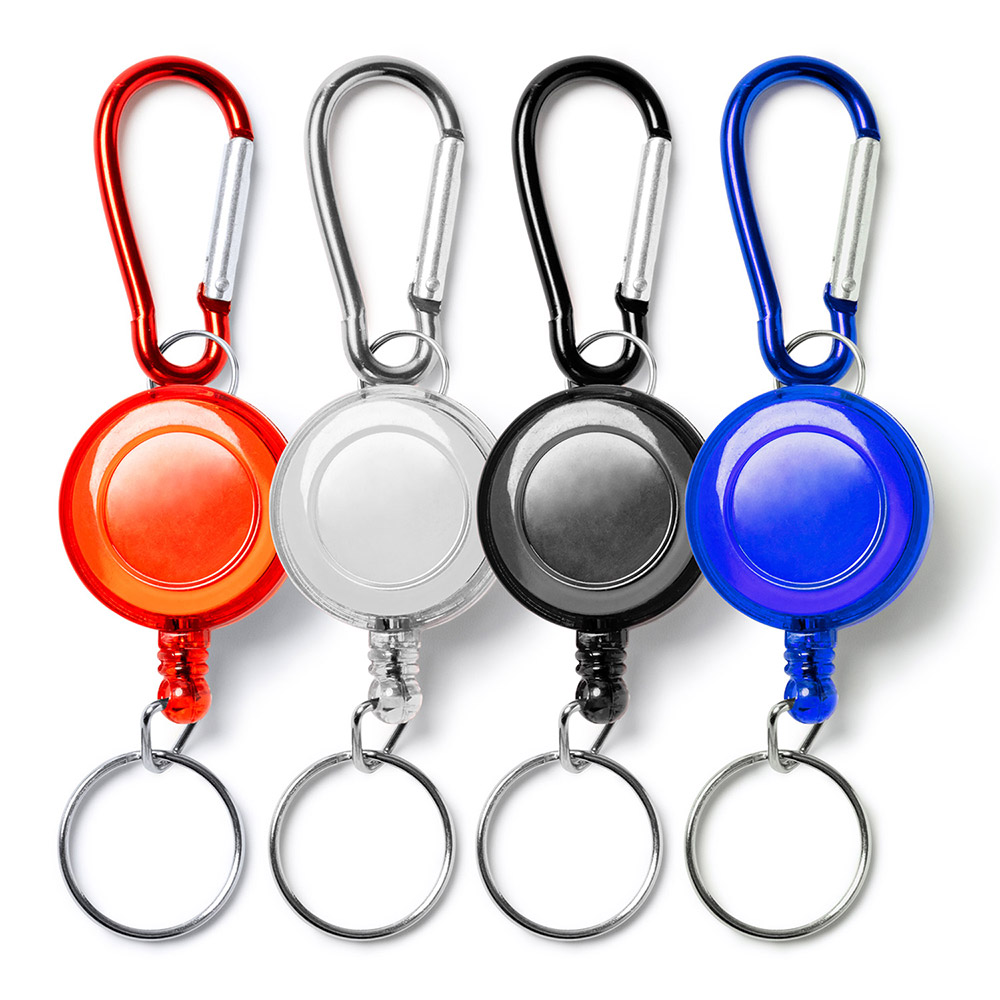 Llavero rollerclip con mosquetón y anilla retráctil extensible.
