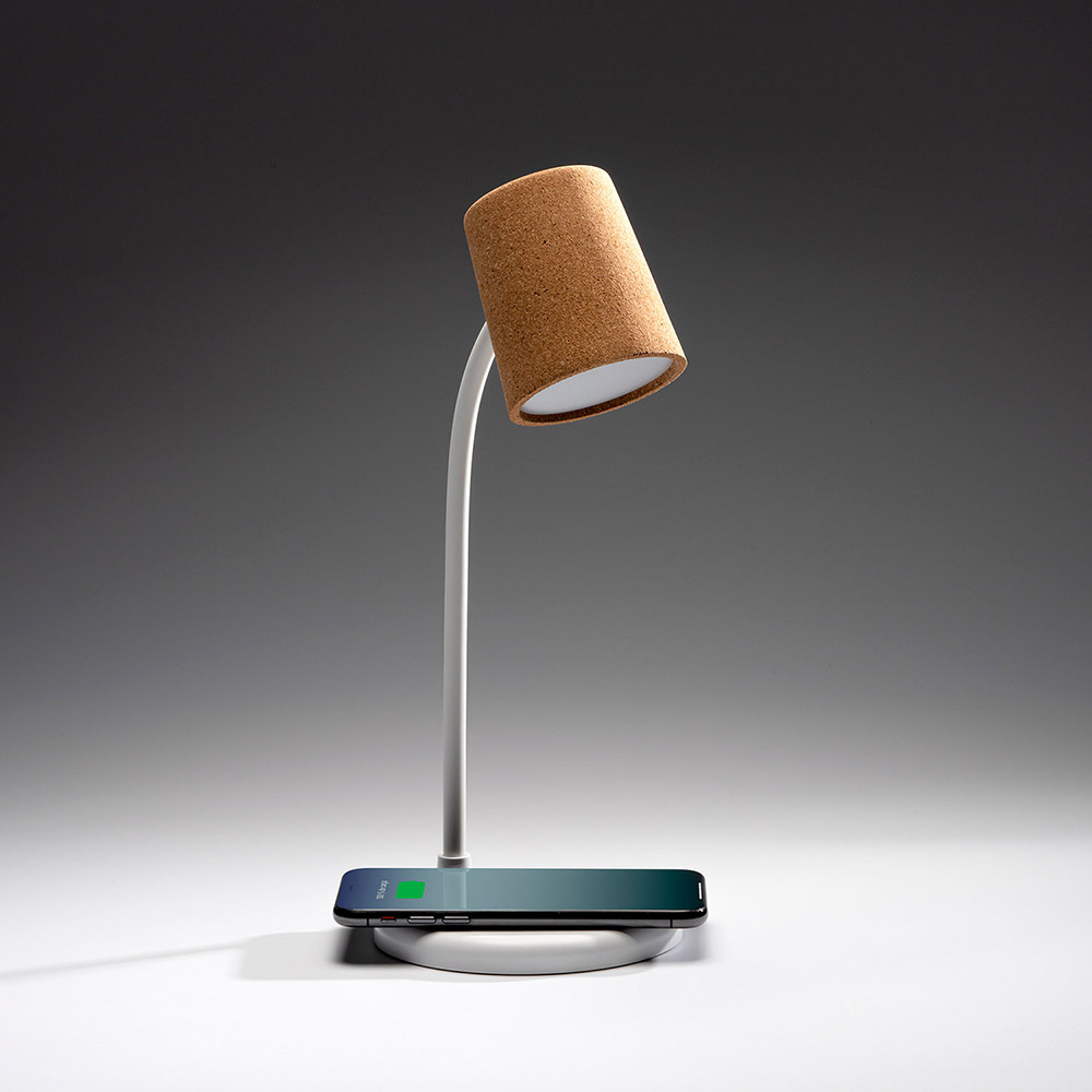 Lámpara con detalles en corcho. Lámpara ideal para tu escritorio, incluye cargador inalámbrico en la base de 10W y altavoz inalámbrico de 3W de potencia. Luz led con tres posiciones de iluminación.