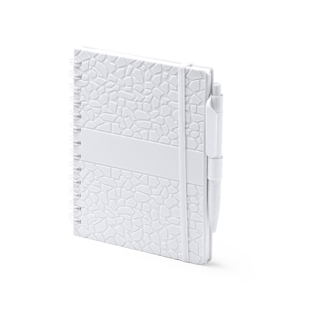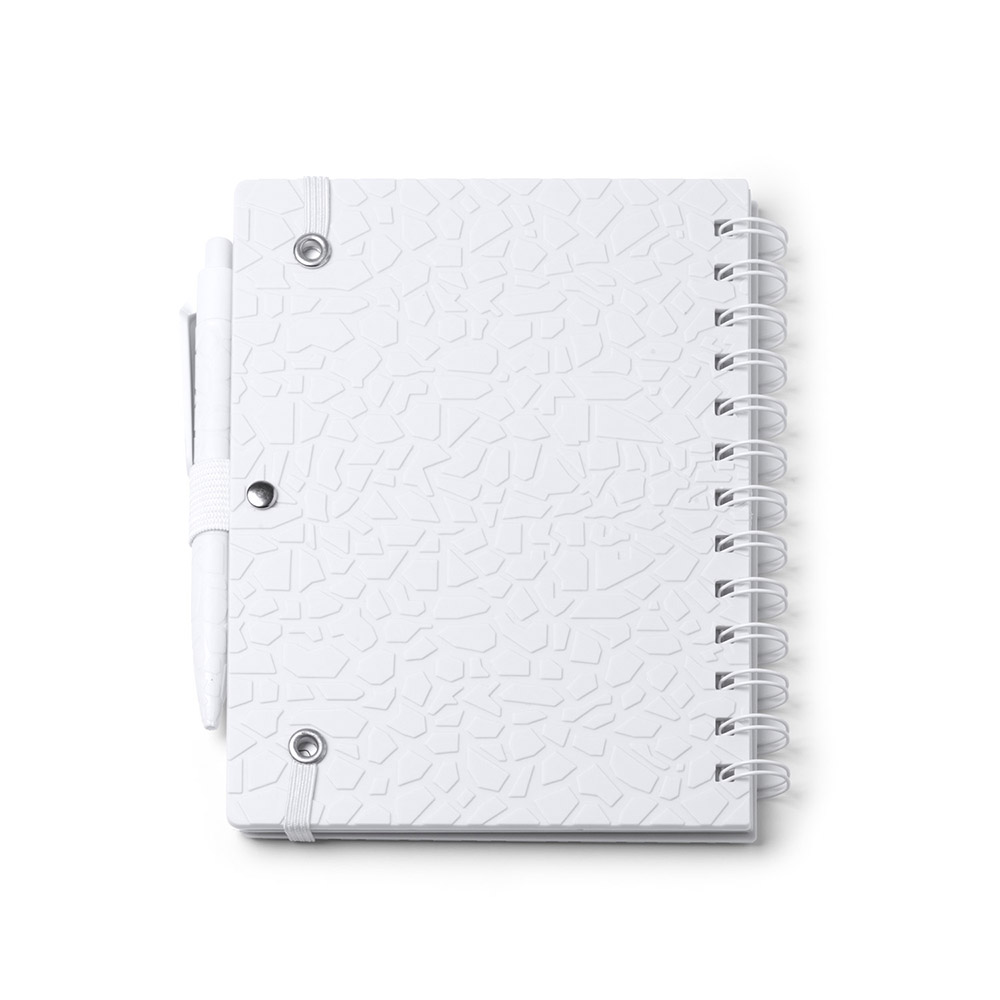 Libreta A5 realizada a base de estractos de piedra. Tapa rígida y doble anilla. Soporte con bolígrafo a juego. Tinta azul. 70 hojas a rayas.