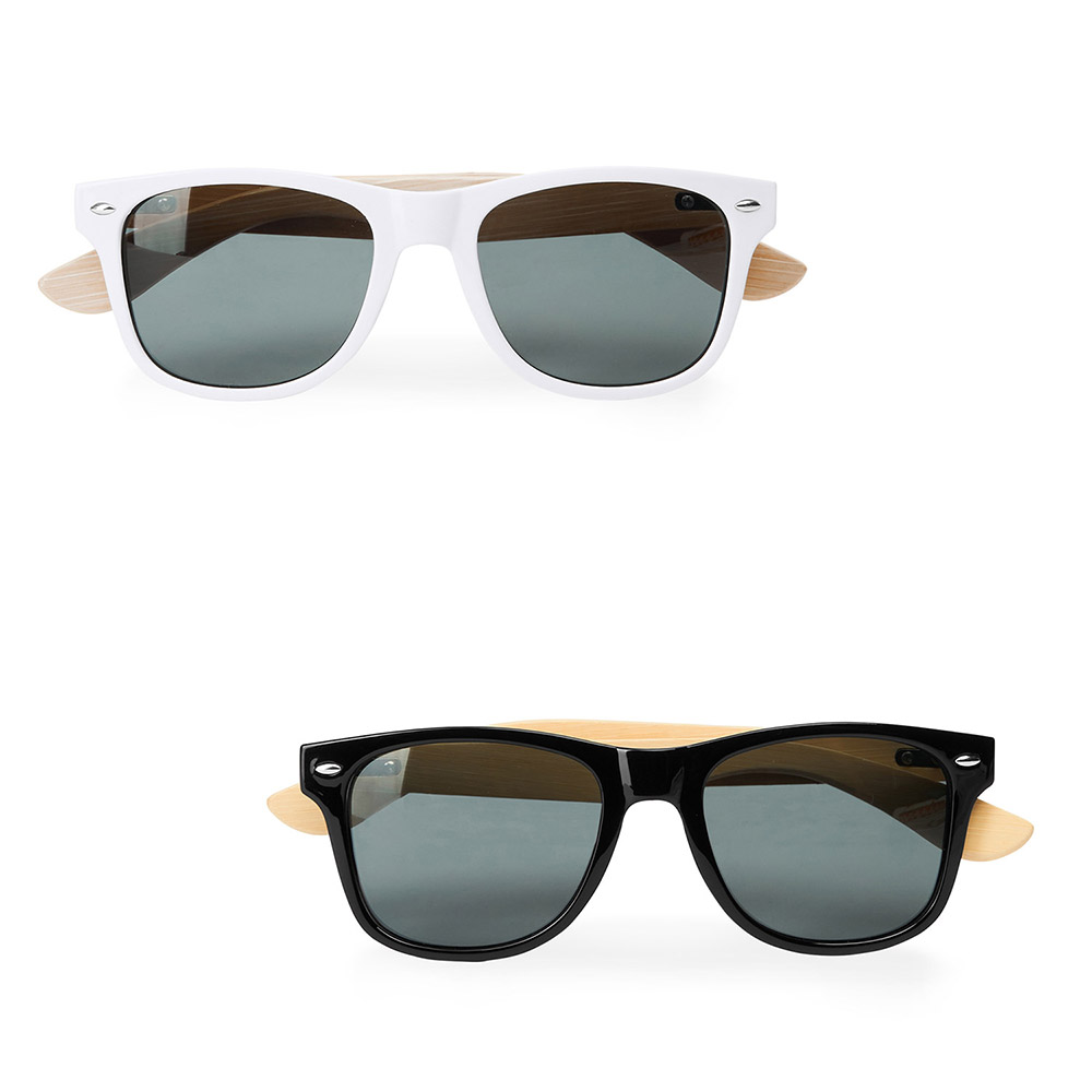 Gafas de sol de atractivo diseño con montura en acabado brillante y patillas en bambú natural. Lentes con protección UV400.