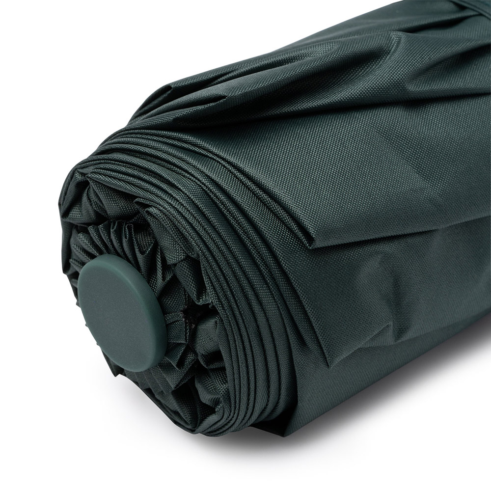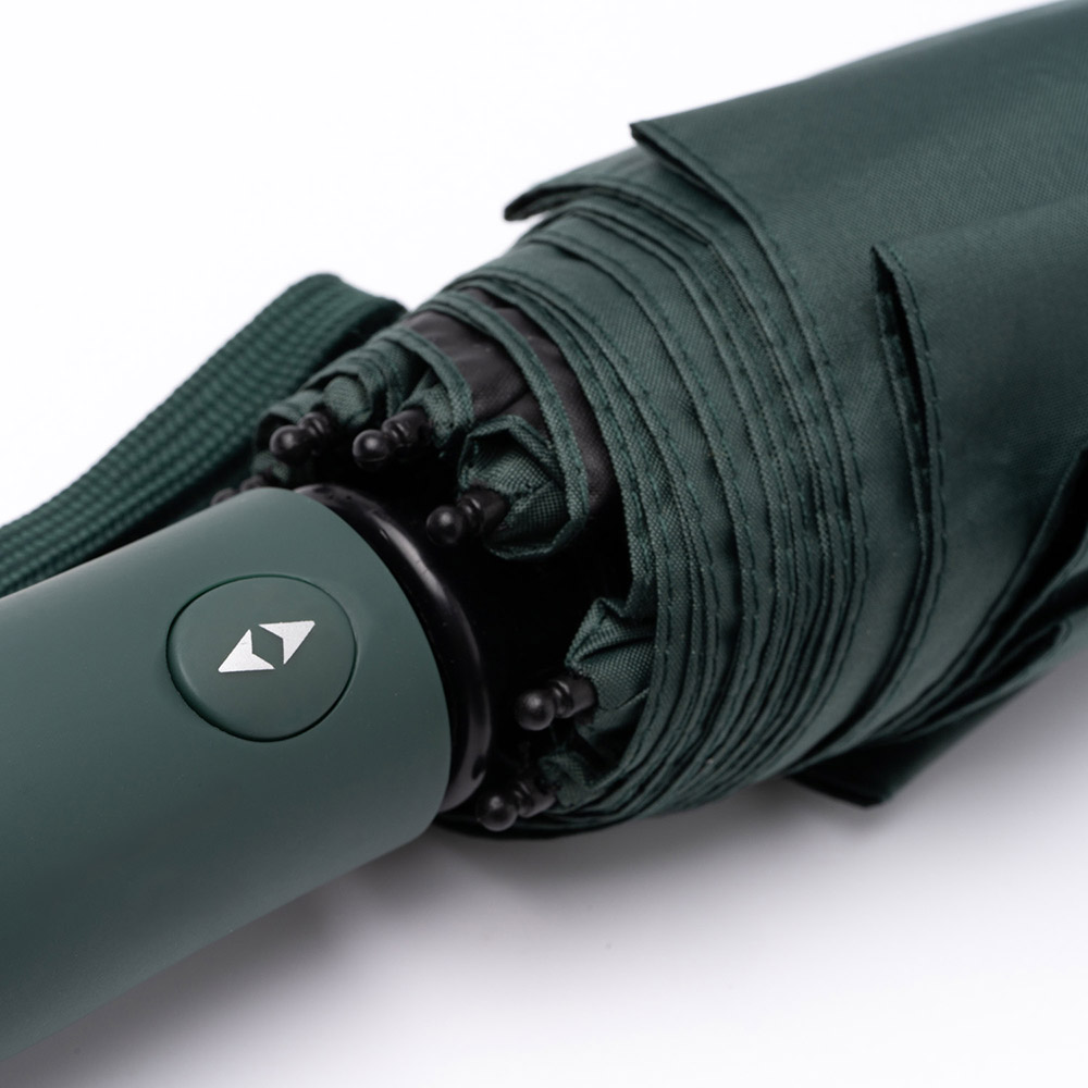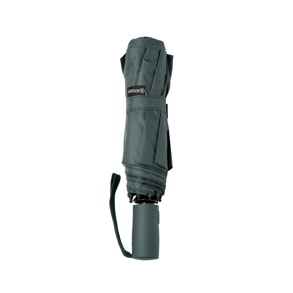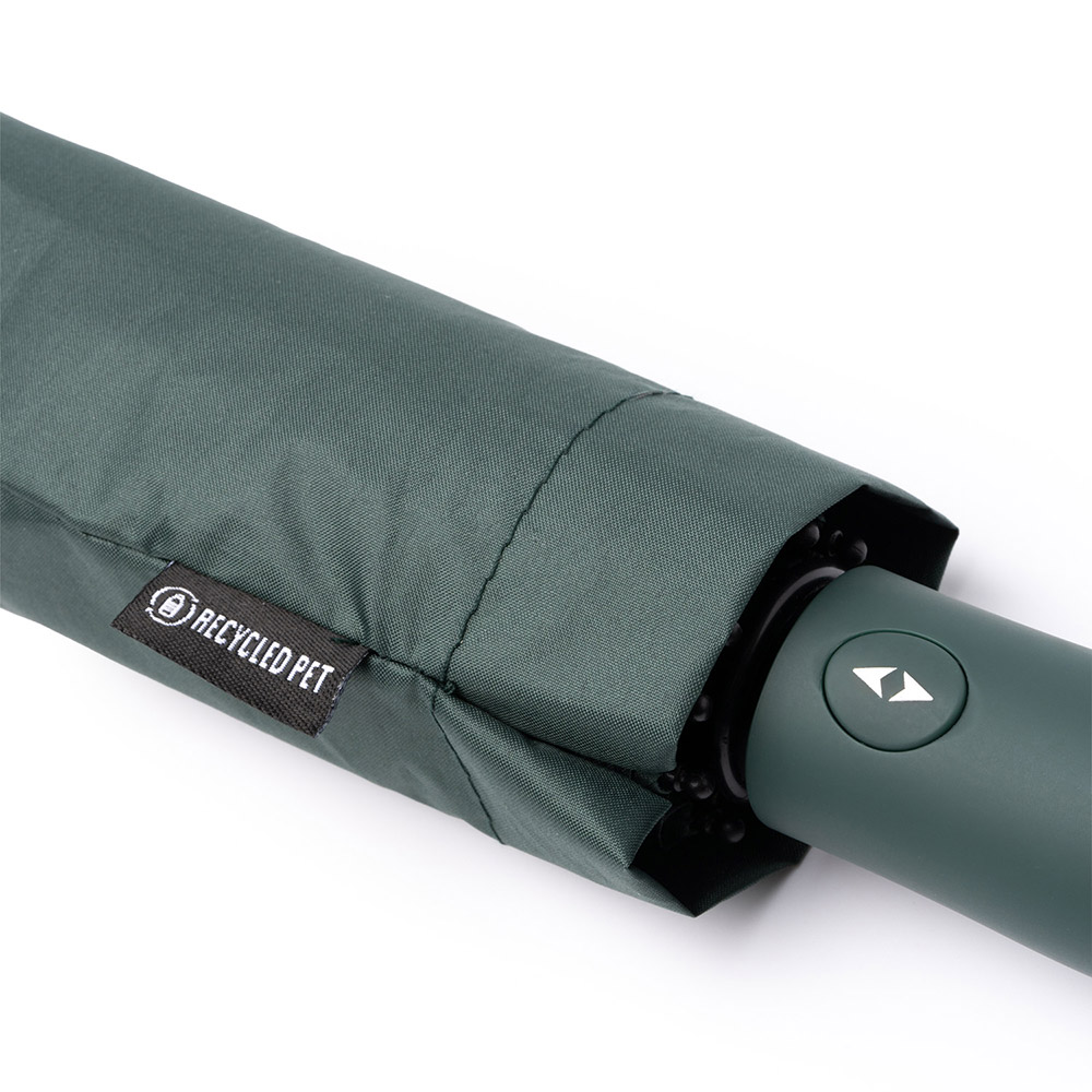 Paraguas plegable realizado en RPET con protección ultravioleta. Apertura y cierre automático. Tejido pongee 190T con protección UV SPF50. Varillas de fibra de vidrio con sistema antiventisca. Cierre de velcro. Incluye funda a juego.