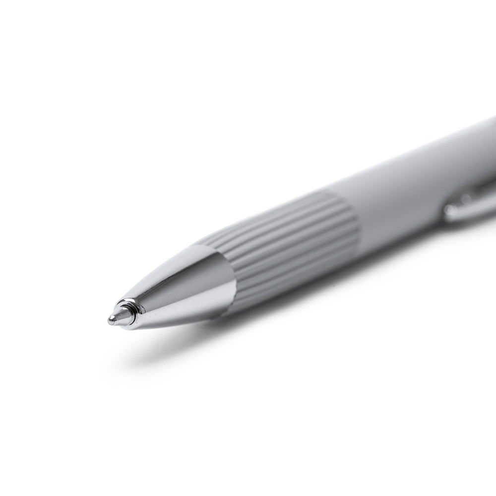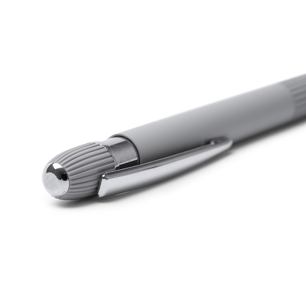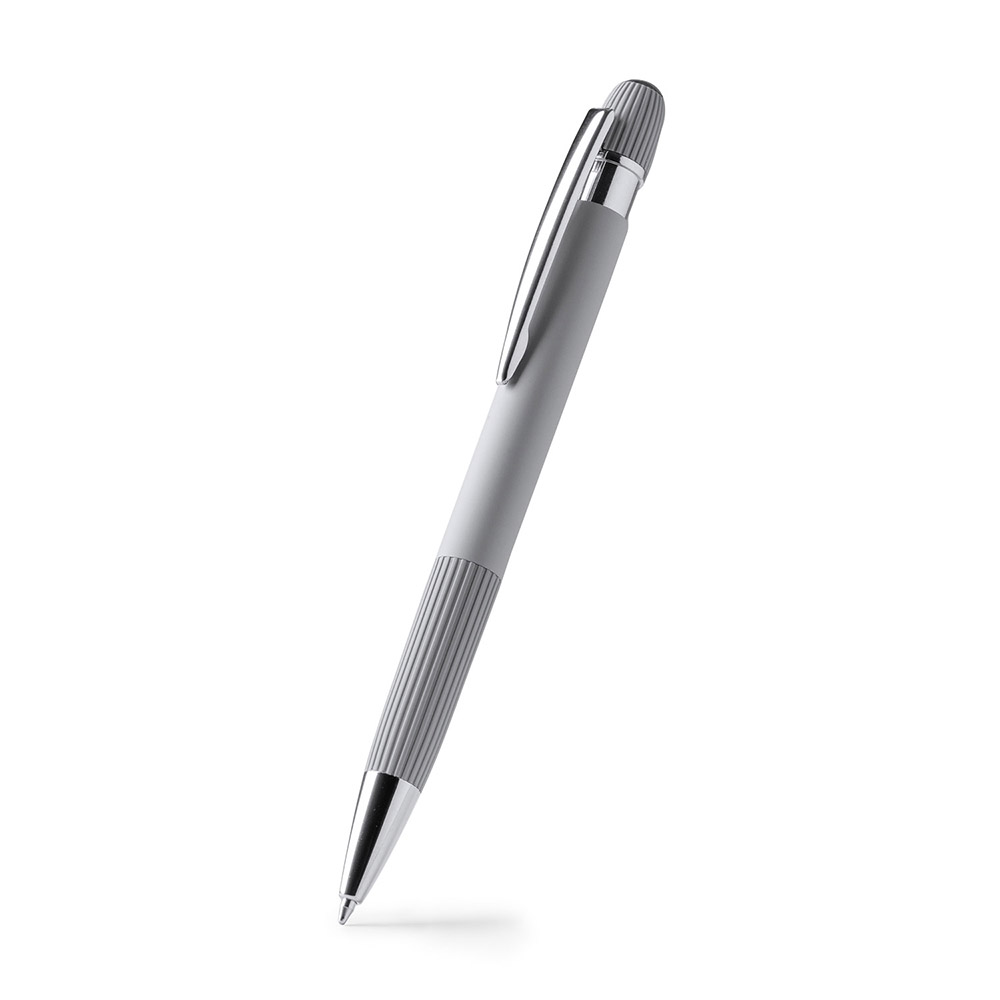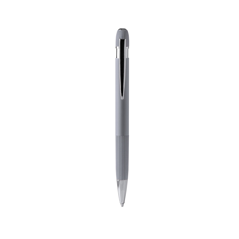 Bolígrafo con cuerpo de aluminio reciclado con agarre rayado y en acabado tacto goma mate. Detalles en acabado cromado. Carga jumbo de tinta azul.