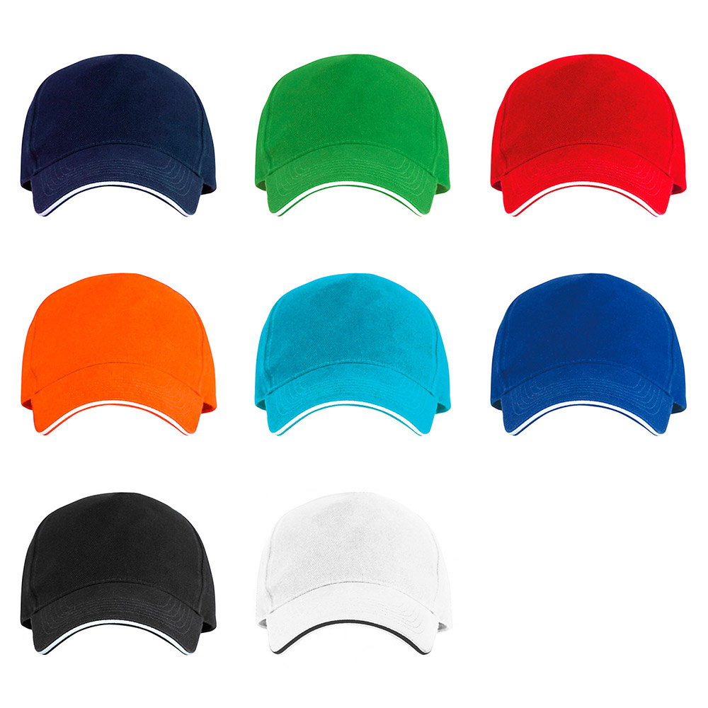 Gorra de 5 paneles con sándwich a contraste. 6 líneas de pespunte en visera. Cuatro agujeros de ventilación. Cinta interior antisudoral. Cierre de velcro.