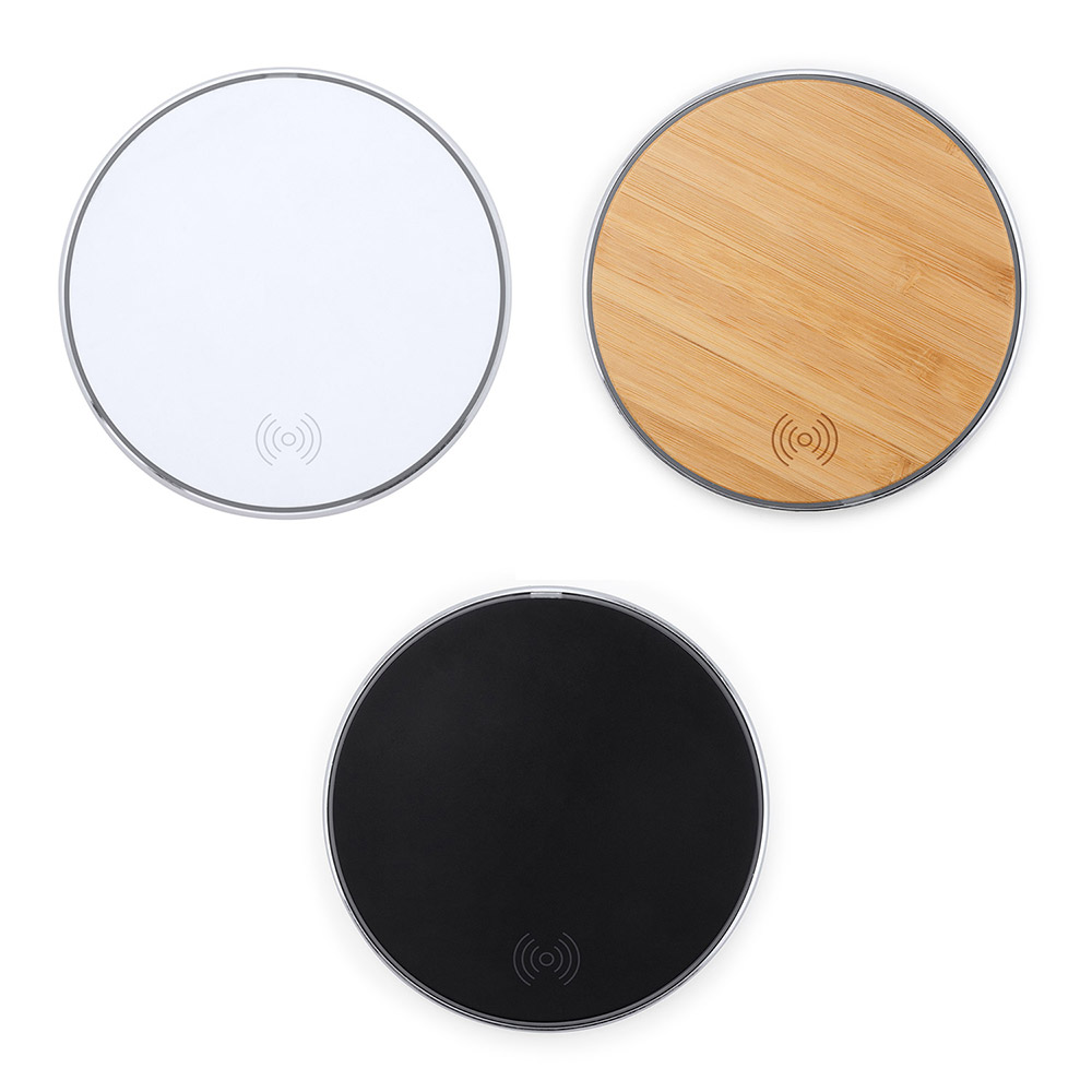 Cargador inalámbrico con 10W de potencia, realizado con cuerpo en aluminio combinado en color y cuerpo de bambú natural. Base antideslizante. Conéctelo, coloque su Smartphone sobre el y déjelo cargar. Una luz le indicará que está cargando. Compatible con dispositivos con tecnología de carga inalámbrica. DC5V/1.0A. Cable incluido.