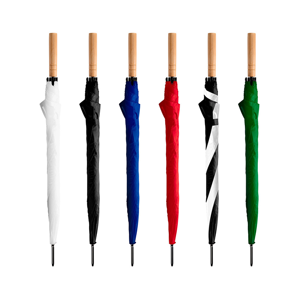 Paraguas con mango en madera y apertura automática. Varillas y terminaciones en negro. Cierre con velcro.