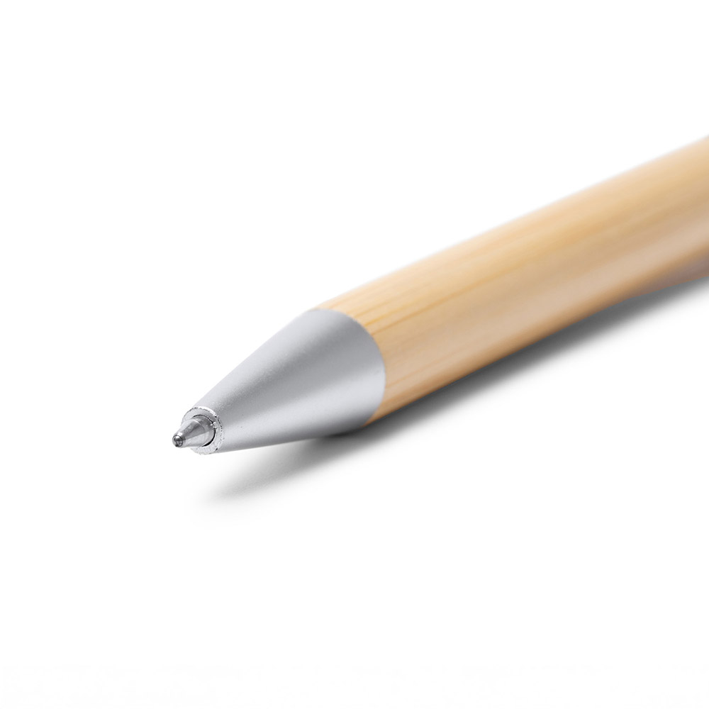 Bolígrafo con spinner antiestrés. Cuerpo de bambú y puntero táctil con detalles en acabado metálico mate. Carga jumbo de tinta azul.