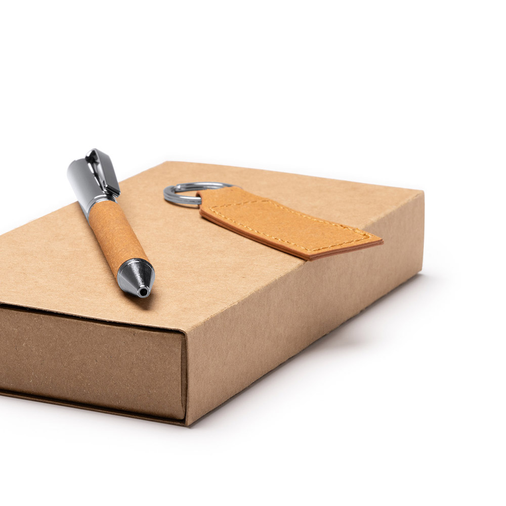 Set de bolígrafo y llavero de piel reciclada con detalles metálicos. Tinta azul. Presentación en estuche eco.