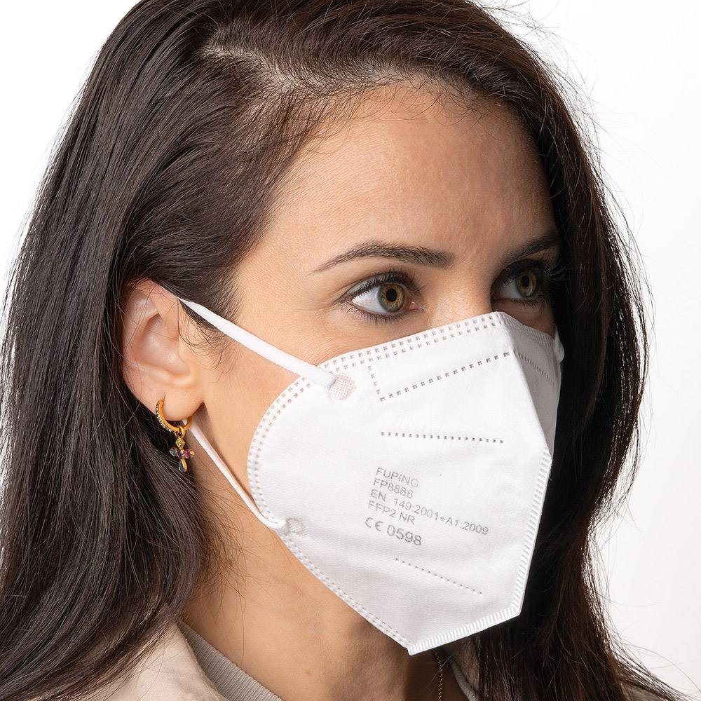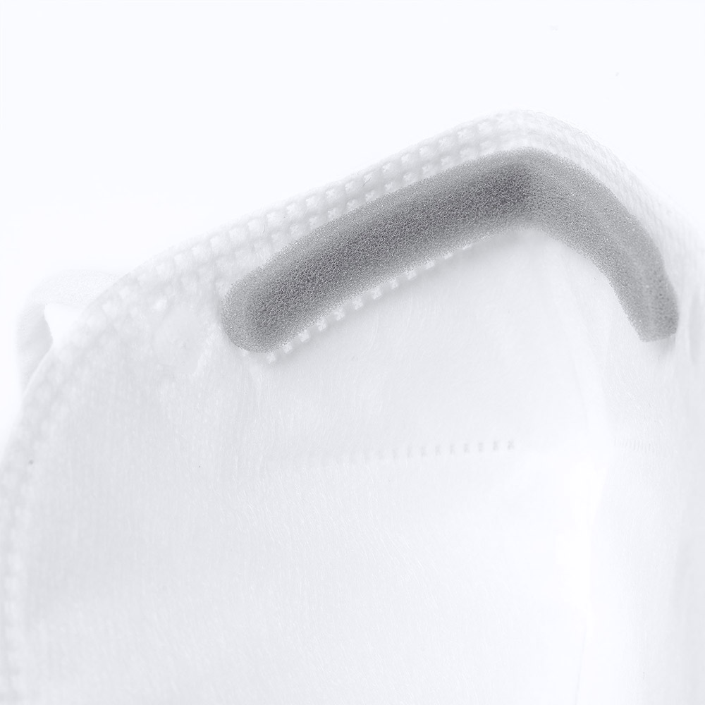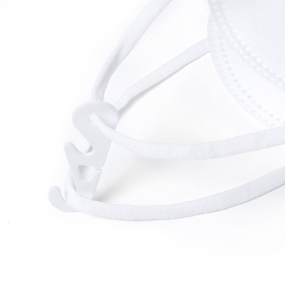 Mascarilla de seguridad FF2 NR de cinco capas. Acabados termosellados, con elásticos de sujeción, accesorio de sujeción craneal, pinza ajustable en la nariz y almohadilla nasal interior.