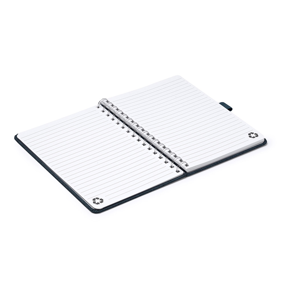 Libreta A5 de portada rígida elaborada con tejido poliéster reciclado RPET y con espiral doble. Incluye banda elástica de cierre y soporte para bolígrafo a juego con la portada. Contiene 80 hojas a rayas, perfecta para notas organizadas y ecológicas.