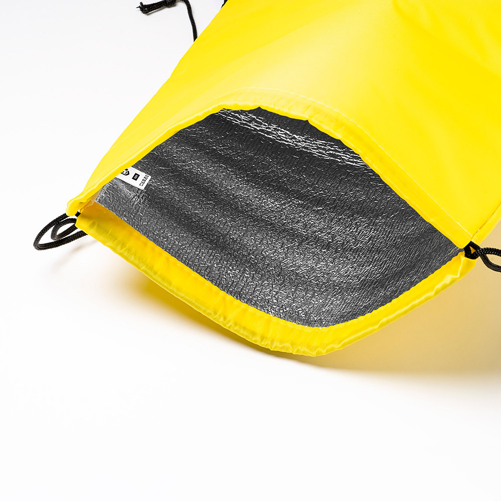 Mochila nevera de cuerdas con interior isotérmico de aluminio. Exterior de poliéster 210D.