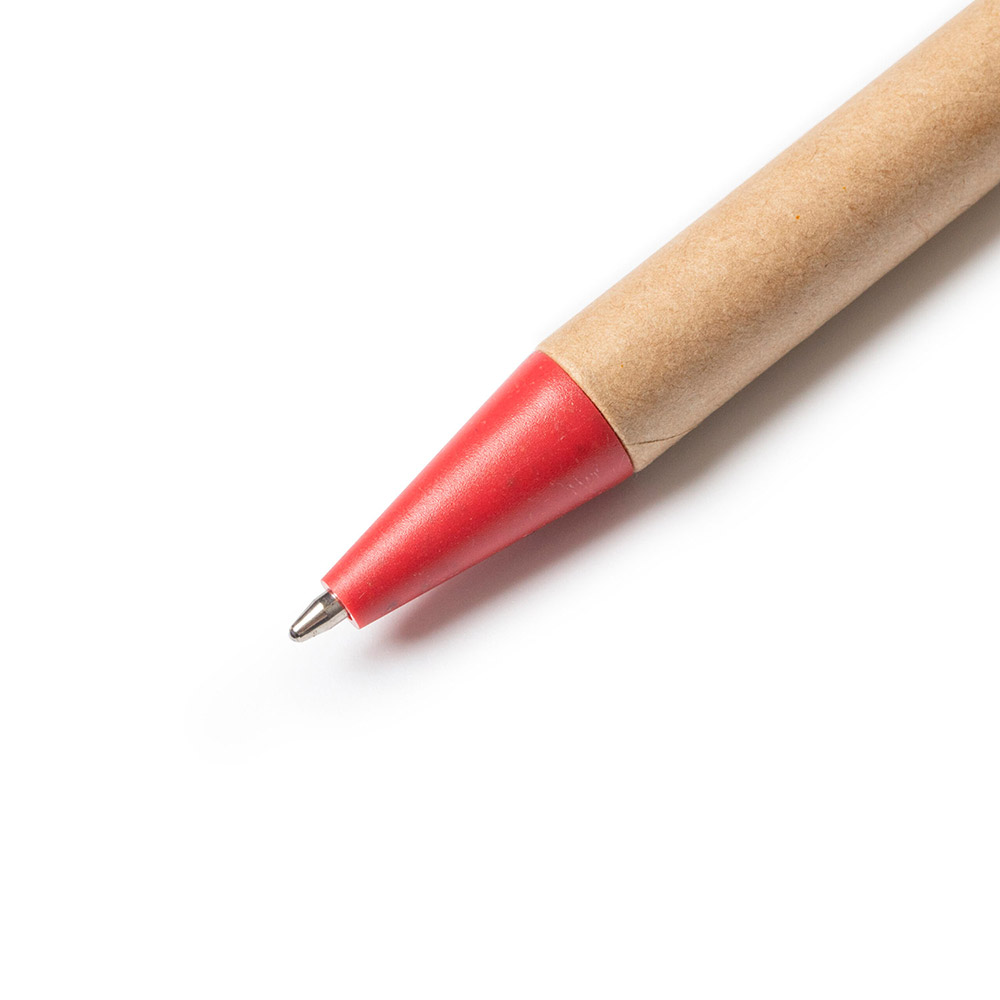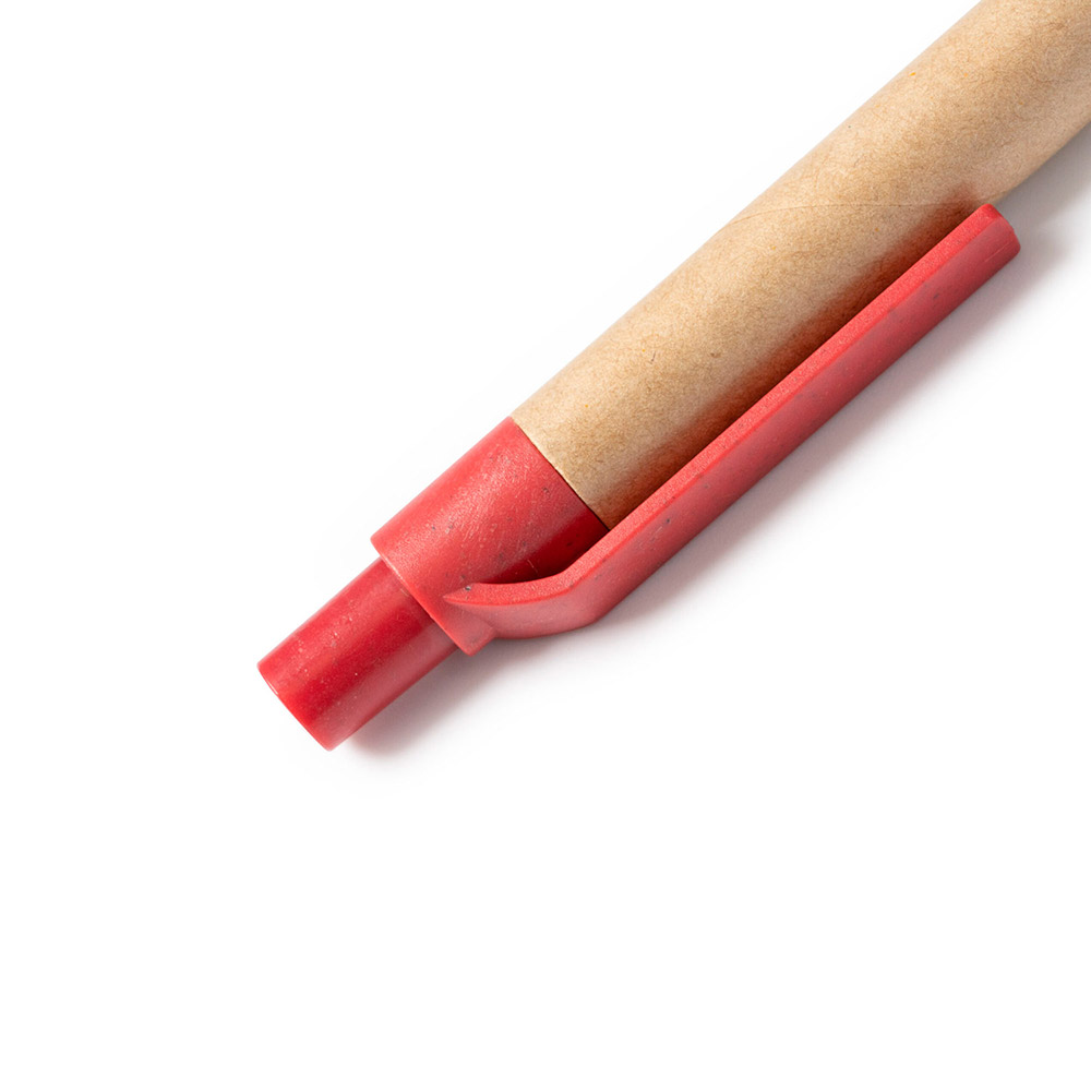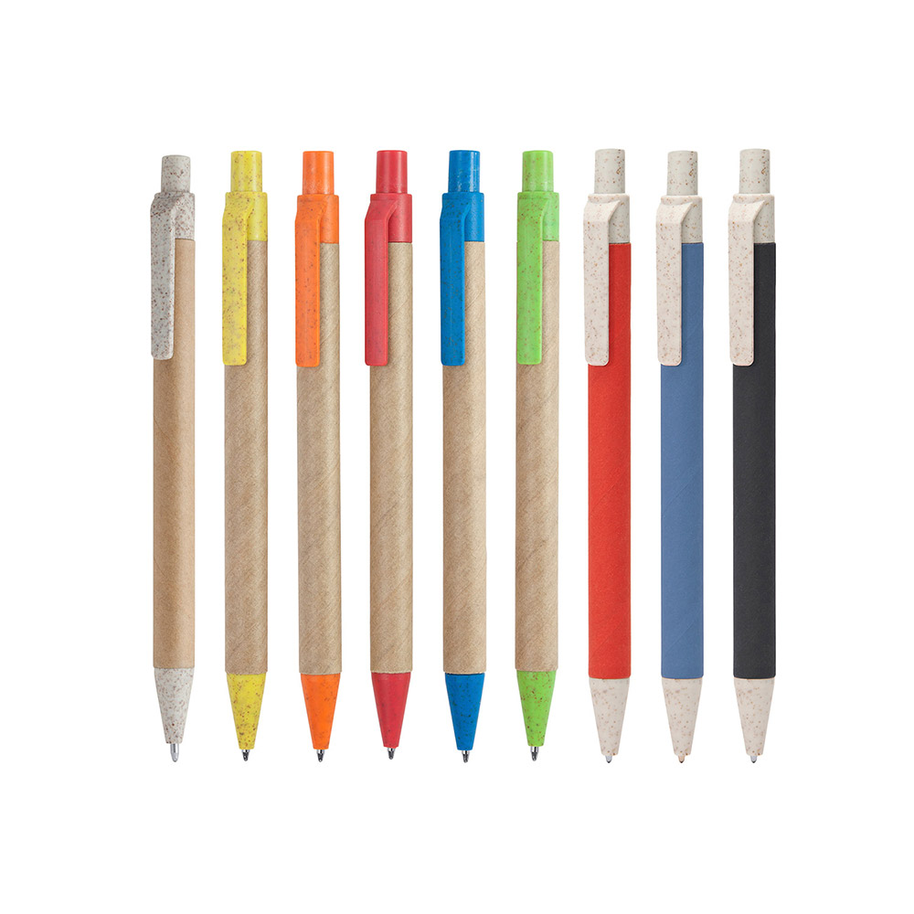 Bolígrafo pulsador hecho en cartón reciclado, con la punta y el clip en fibra de trigo y ABS. Tinta azul.