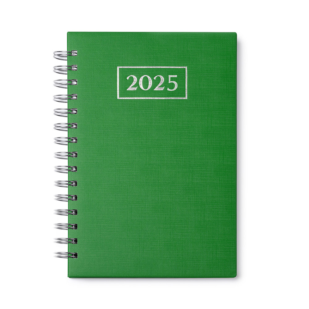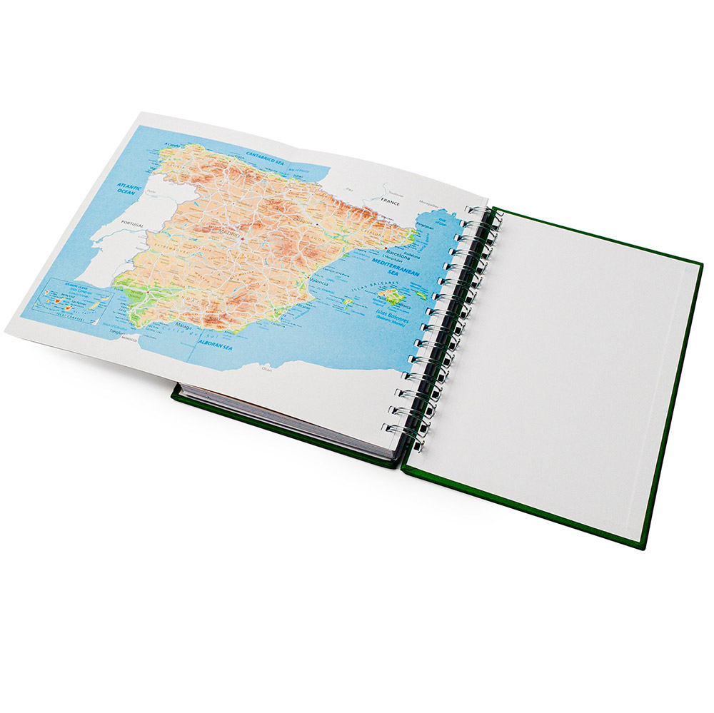 Agenda con anillas tamaño A5. Tapas de PU acolchadas con grabado bajo relieve. 348 páginas más 4 páginas con mapas. Gramaje del papel 60gsm. Papel interior de color blanco. Diseño página día con esquinas troqueladas.