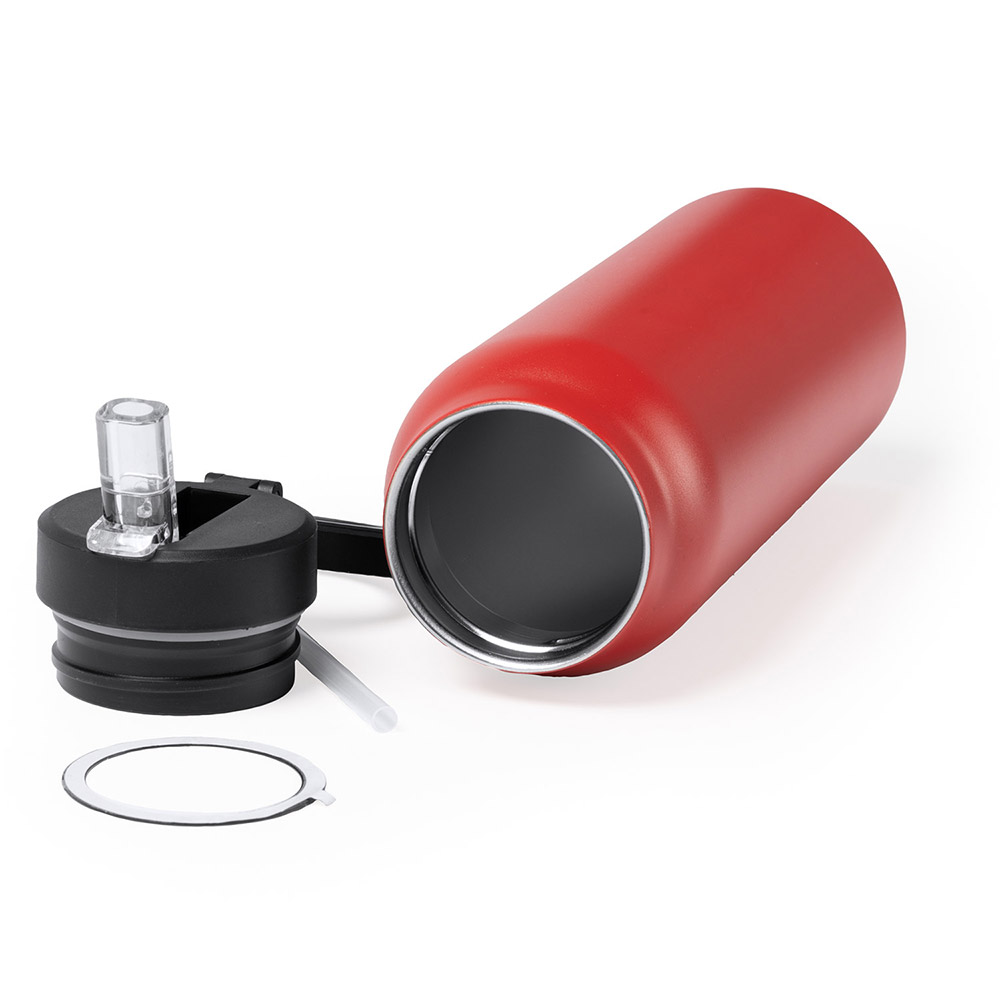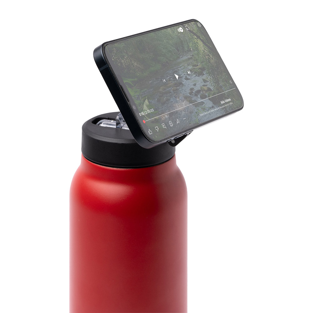 Bidón térmico de acero inoxidable 304 reciclado de doble pared. Tapa con aro magnético para soporte de móvil. Con pajita plegable y goma antideslizante en la base. Capacidad 750 ml.