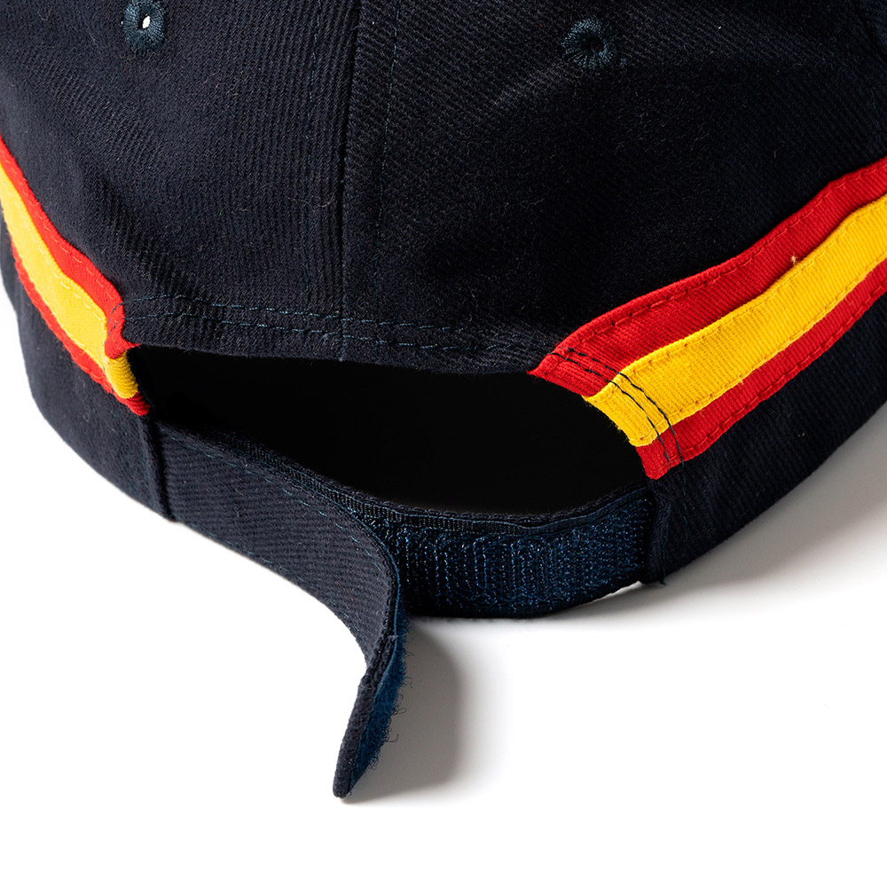 Gorra de 6 paneles 100% algodón peinado con diseño de bandera nacional. Cierre ajustable de velcro y orificios de ventilación.
