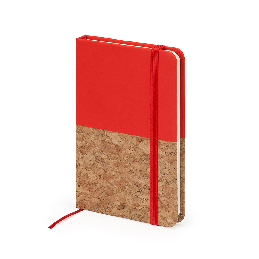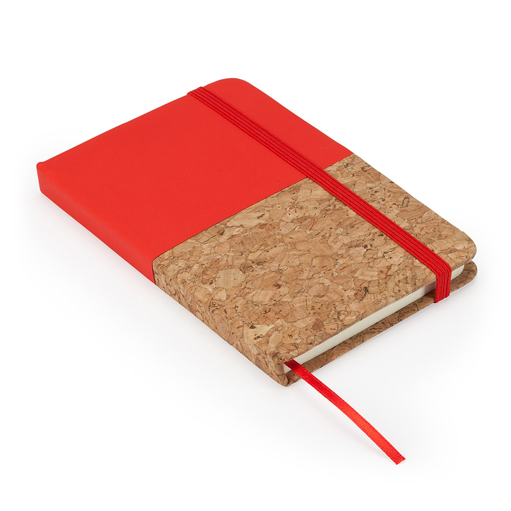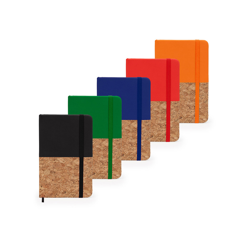 Bloc de notas A6. Tapa rígida mixta corcho / polipiel. Marcapáginas y banda elástica. 80 hojas lisas.
