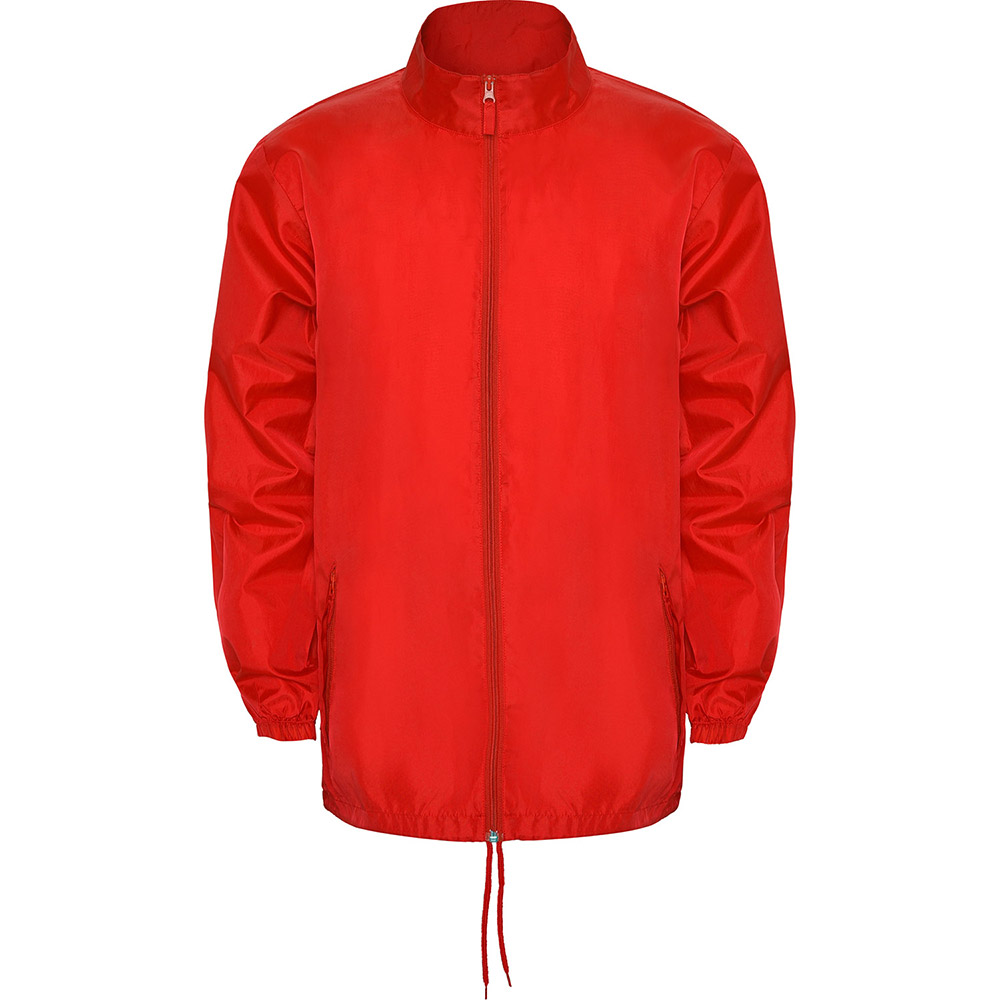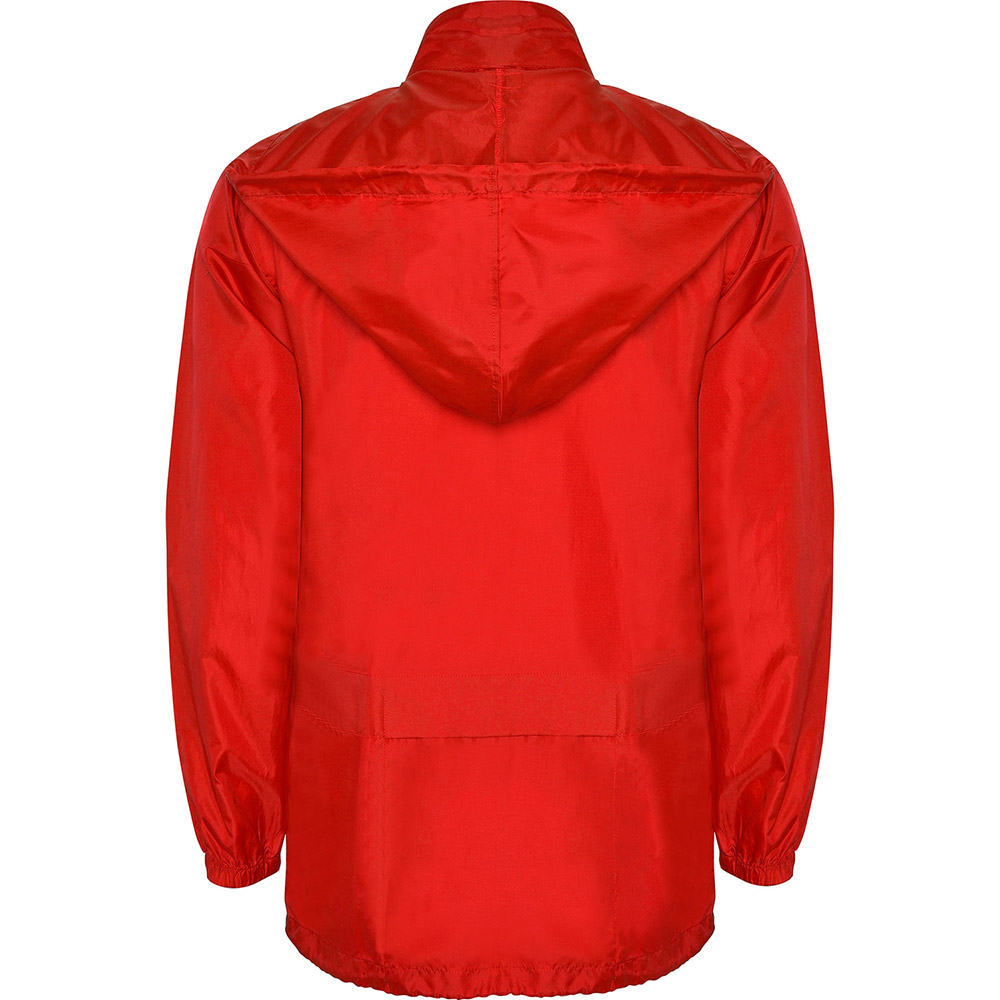 Chubasquero unisex. Cuello alto y capucha extraíble con cordones ajustables. Cremallera central al tono con tirador. Dos bolsillos laterales de cremallera con solapa. Puños elásticos. Bajo con cordones ajustables en interior. Goma elástica en el interior del bolsillo para su plegado y guardado.