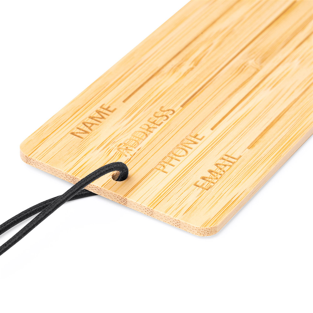 Identificador de maletas de bambú. Con banda elástica en color negro.