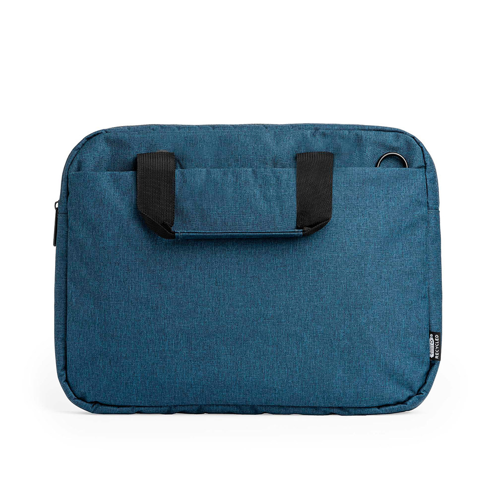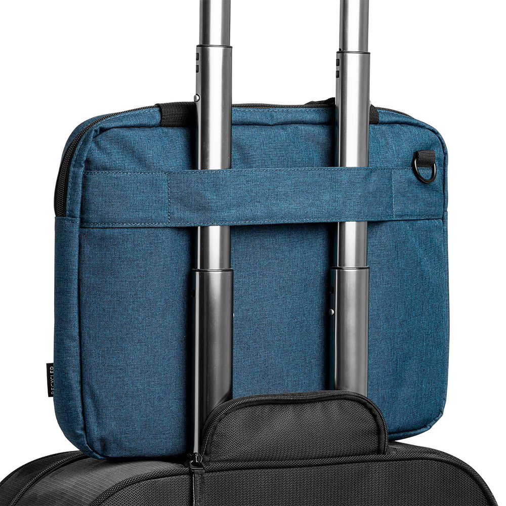 Portadocumentos acolchado para portátil realizado en poliéster reciclado RPET 600D con diseño vigoré. Dos compartimentos con cremallera impermeable. Asas de transporte y cinta bandolera ajustable a juego. Incluye cinta para trolley.
