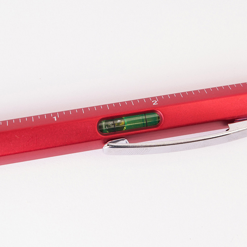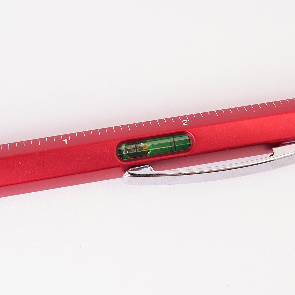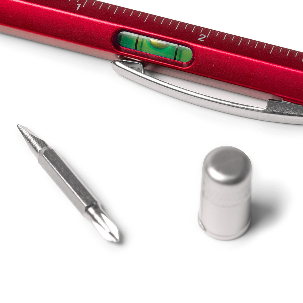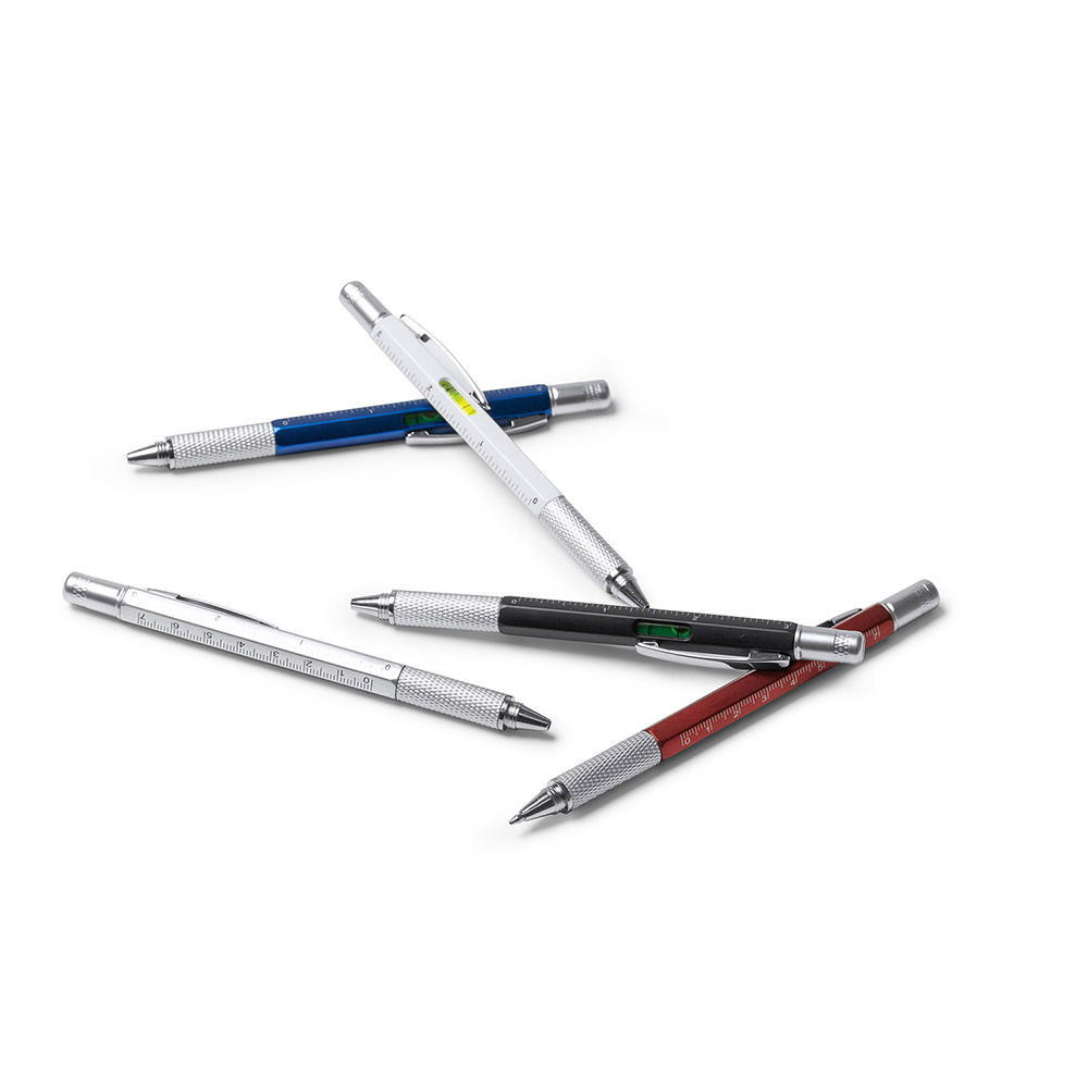 Bolígrafo multi-herramienta con las siguientes herramientas: nivel, regla en centímetros y pulgadas, destornillador plano y destornillador en estrella. Cuerpo disponible en varios colores. Mecanismo giratorio. Tinta azul.