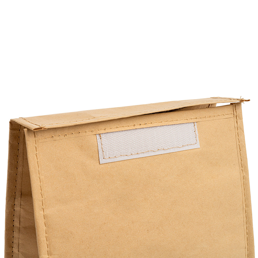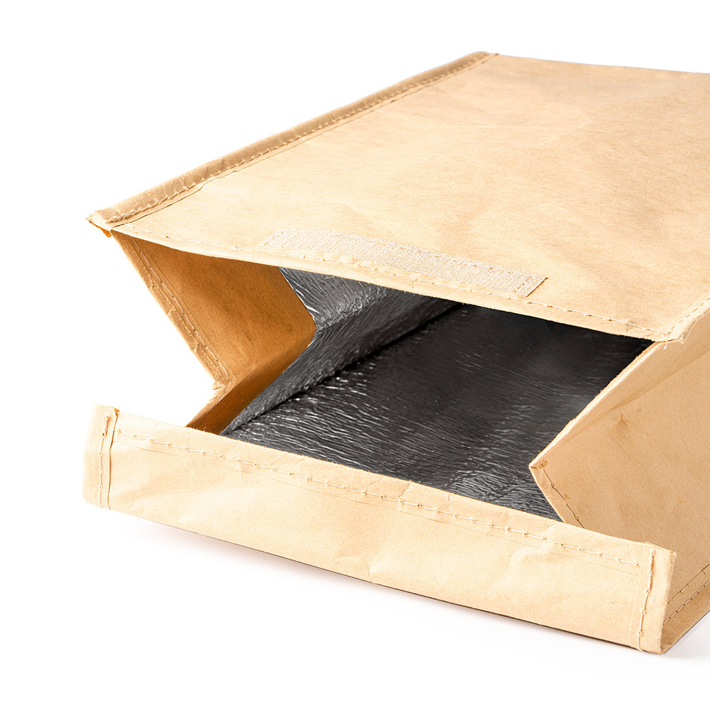 Bolsa Nevera de papel laminado con interior isotérmico de aluminio. Transporta tu bebida o comida a cualquier lugar con una temperatura adecuada. Solapa y bolsillo exterior con cierre de velcro.