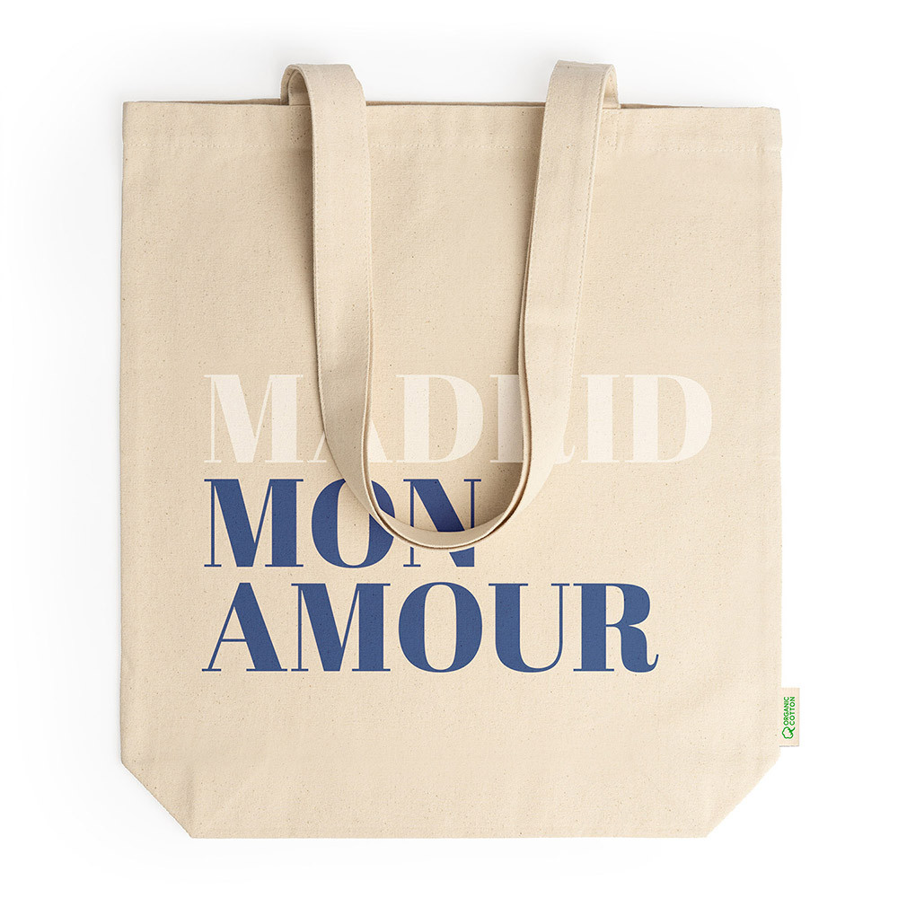 Bolsa 100% algodón orgánico de 280 g/m² con fuelle y prácticas asas largas de 70cm.