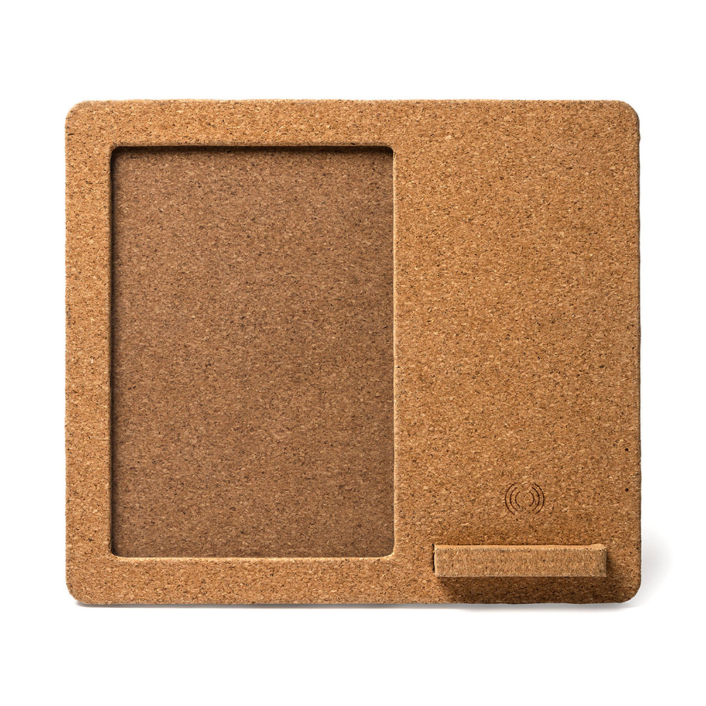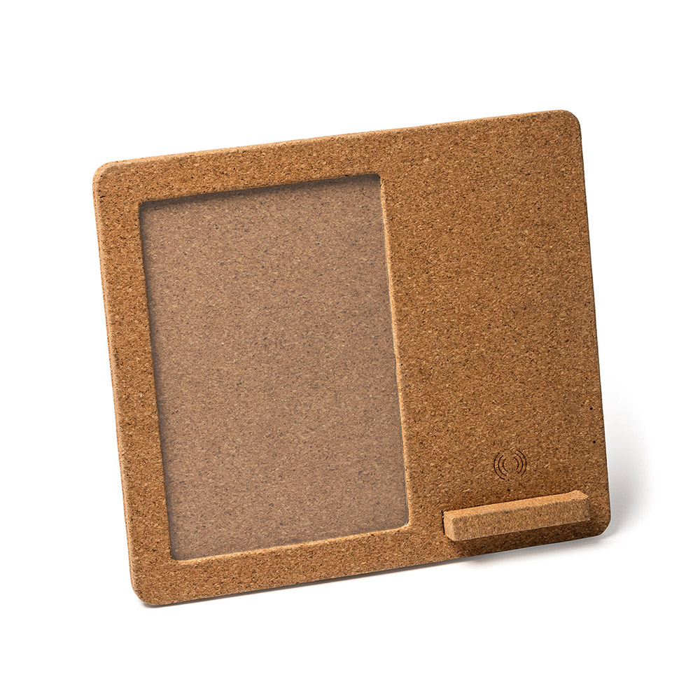Cargador inalámbrico con marco para fotos realizado en corcho. Ideal para fotos 10×15 cm. Compatible con dispositivos con tecnología de carga inalámbrica. 10 W. Cable incluido.