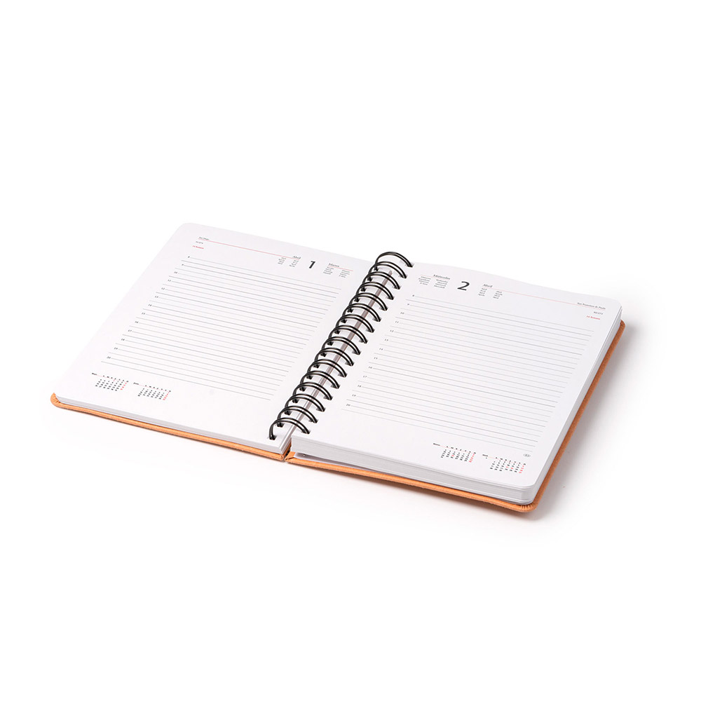 Agenda con anillas tamaño A5, con tapas de cuero reciclado grabadas en bajo relieve y banda elástica. Cuenta con 348 páginas de papel blanco y 4 páginas adicionales con mapas. Ideal para mantener tus notas organizadas con estilo y durabilidad.